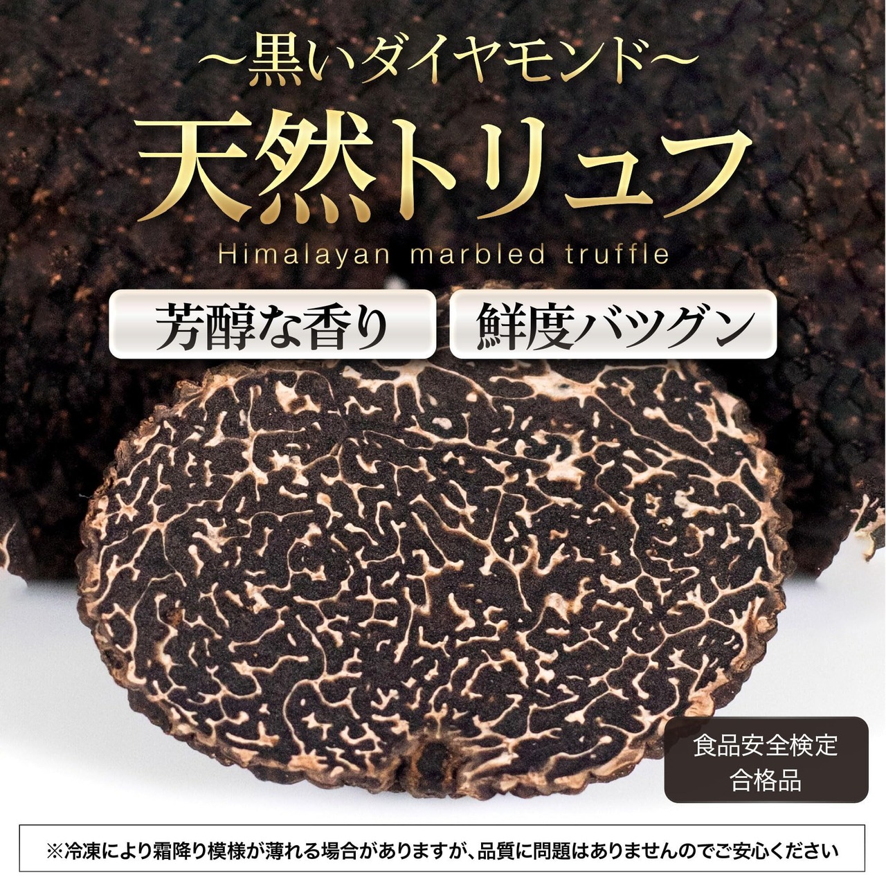 【天然黒トリュフの魅力】 天然黒トリュフは、その独特な香りと風味で世界中のグルメたちを魅了しています。特に中国のヒマラヤ産の黒トリュフは、他の地域のものを超える芳醇な香りを持ち、料理に深い味わいを与えます。 ※商品は鮮度を保つため、冷凍便でお届けします。冷凍による氷の膨張効果により、トリュフの文様が薄くなったり消えてしまう場合がございますが、品質には影響ございませんので、安心してお召し上がりください。