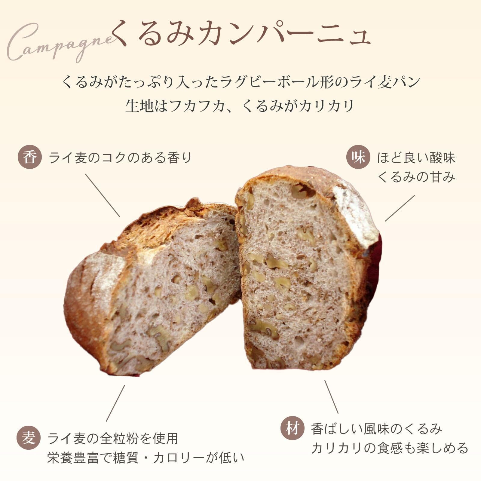 【京都・亀岡からお届け】天然酵母と香ばしい胡桃のハーモニー。滋味深く、体に優しいパン グリムのパンドカンパーニュは、豊かな自然に育まれた自家製天然酵母を使い、じっくりと時間をかけて熟成させました。 口にした瞬間、広がる小麦の風味と、ほのかな酸味が食欲をそそります。 天然酵母が生み出す、まろやかな酸味と日持ちの良さ 天然酵母の乳酸菌がもたらす乳酸作用により、生地は程よい酸味を帯び、味わいを深めます。 また、この自然の力が、化学合成物に頼らずともパンの美味しさと日持ちを両立させています。先人の知恵に学んだ、伝統の製法です。 カリフォルニア産クルミを贅沢に。安全安心ヘルシーな北海道産ライ麦全粒粉 香ばしくローストしたカリフォルニア産のクルミを、惜しみなくたっぷりと練り込みました。 クルミに含まれる不飽和脂肪酸は、健康を気遣う方にも嬉しいポイント。 さらに、ライ麦全粒粉を使用することで、豊かな風味と食物繊維が加わり、よりヘルシーなパンに仕上がっています。 水へのこだわり。京都・亀岡の弱酸性硬水 パンの美味しさを支えるのは、私たちの工房がある亀岡市の清らかな水。 国内でも珍しい弱酸性の硬水は、パン生地の風味を豊かに引き立てます。 安心安全。無添加のやさしさ 化学合成物は一切使用せず、厳選した原材料のみで焼き上げました。 フランス産小麦粉、カリフォルニア産クルミ、北海道産ライ麦粉、天然酵母(ライ麦由来)、ヒマラヤ岩塩。 安心してお召し上がりいただける、体に優しいパンです。 原材料:フランス産小麦粉、カリフォルニア産クルミ、オーガニックライ麦粉、天然酵母(ライ麦由来)、ヒマラヤ岩塩 アレルギー物質(表示義務品目):小麦、くるみ グリムが自信を持ってお届けする、こだわりのパンドカンパーニュ。 そのままでも、軽くトーストしても美味しくお召し上がりいただけます。 ぜひ、自然の恵みと職人の愛情が詰まった味わいをお楽しみください。