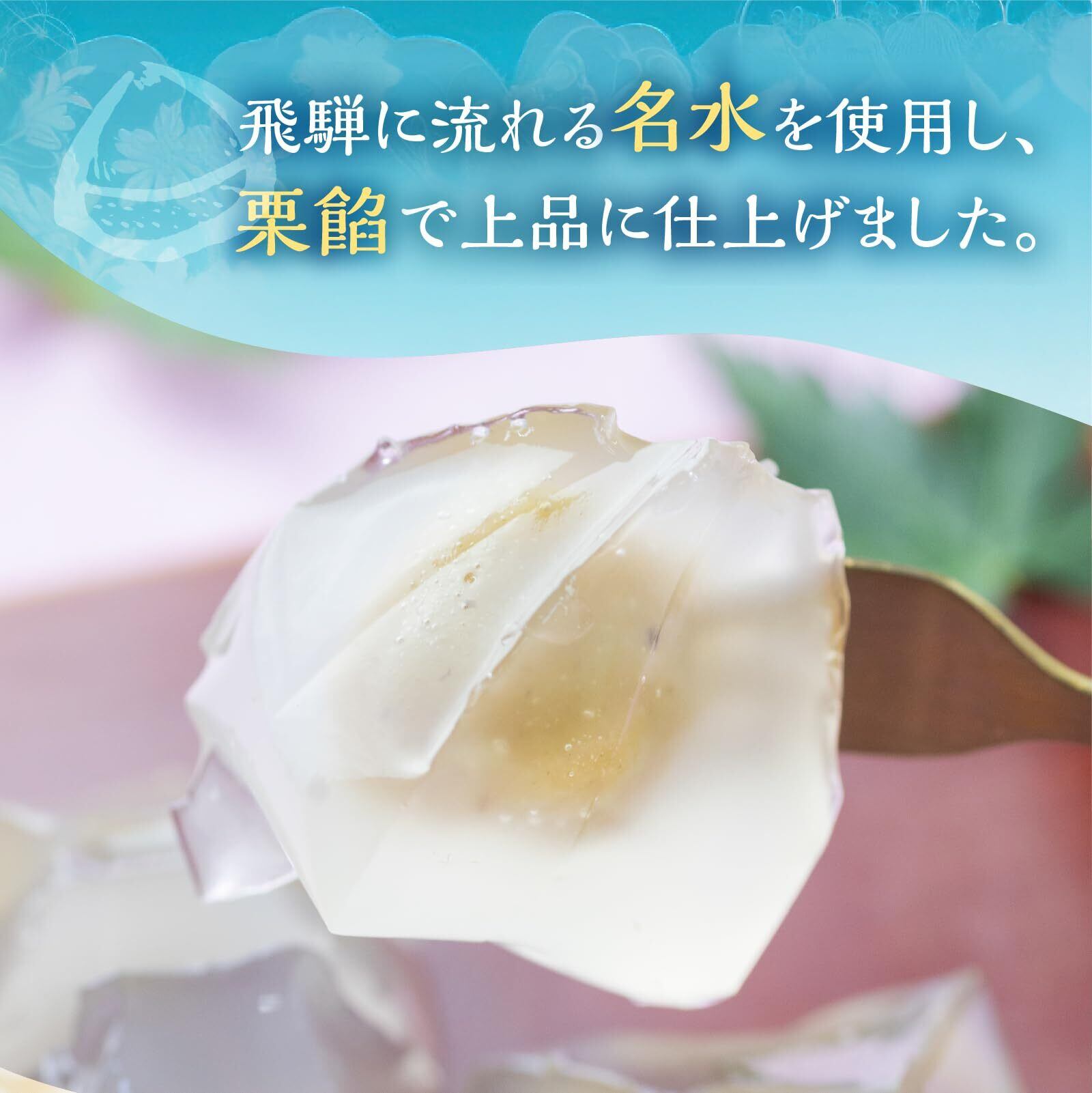 【栗きんとん水まんじゅう】飛騨の名水を使用し、栗餡で上品に仕上げました。 冷蔵庫で冷やしてからお召し上がり頂くとプルプルの触感がたまりません。 一口サイズで個包装タイプなのでお茶請けにもピッタリの一品です。