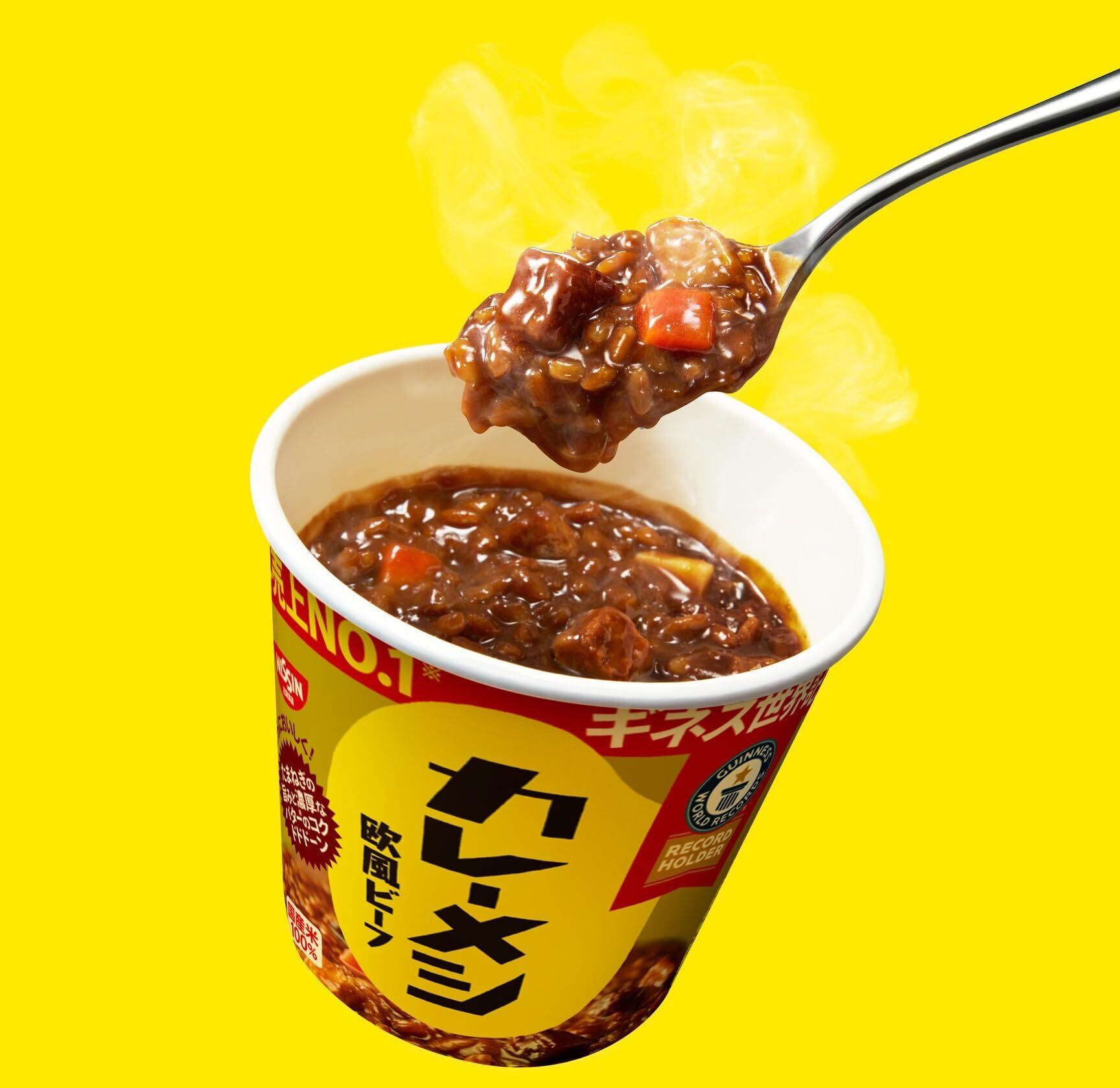 お湯かけ5分でカレーメシ! カレーメシビーフがリニューアル!バターの風味とスパイス感がアップし、さらに美味しい欧風ビーフカレーになりました。世界一売れている即席カップライスとしてギネス世界記録も獲得した一品をぜひご賞味ください。