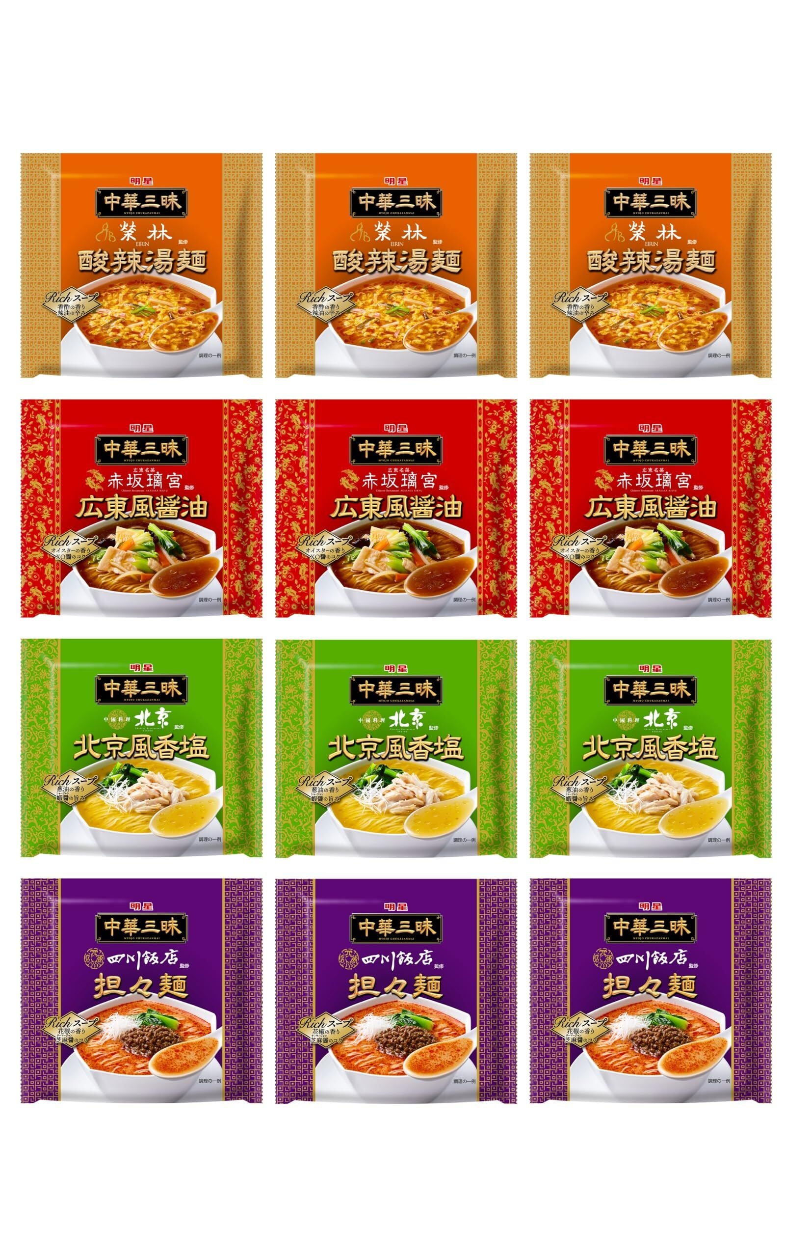 【EC限定】明星 中華三昧(袋)4種アソート12食(広東風醤油、北京風香塩、酸辣湯麺、担々麺 各3食)【セット買い】
