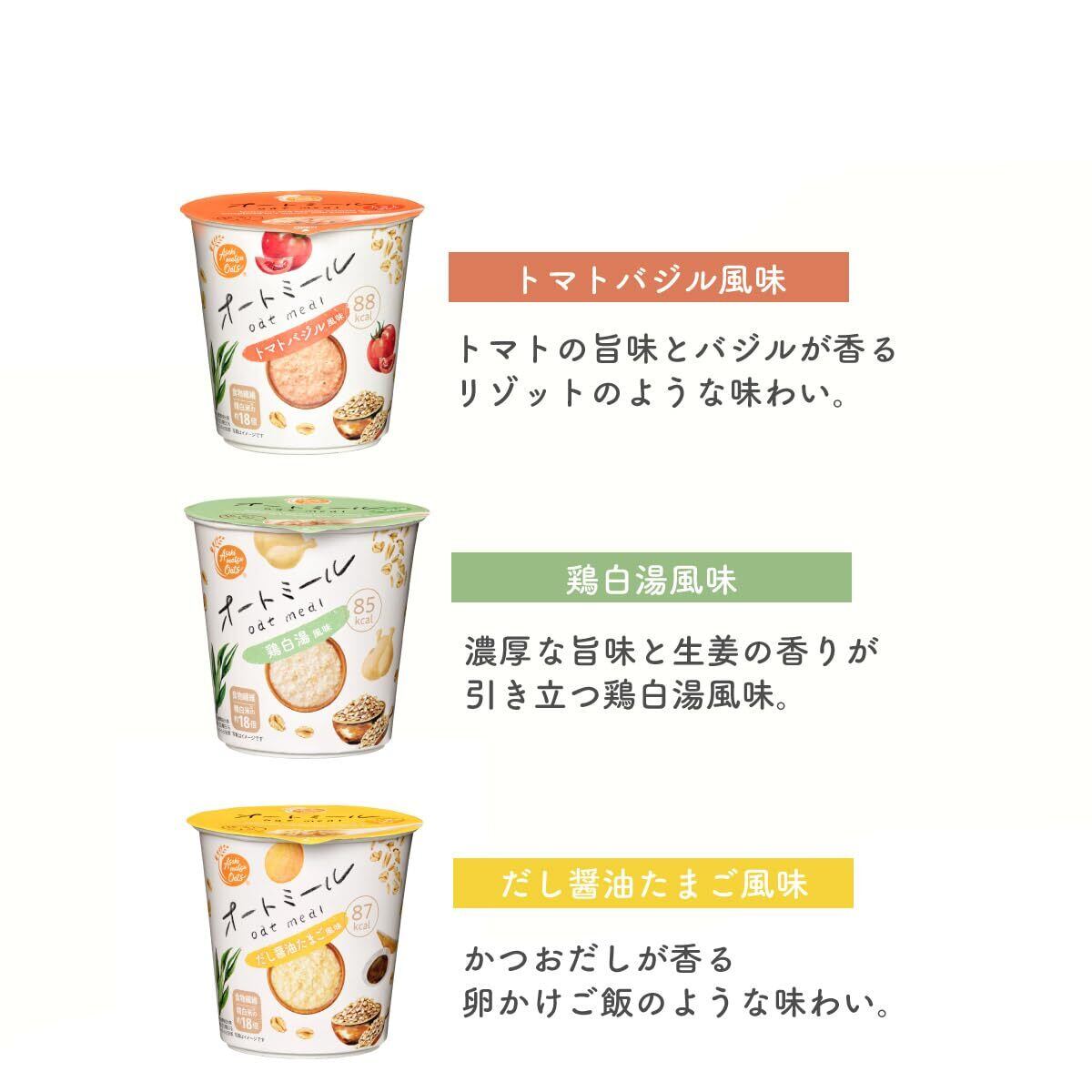 オートミールトマトバジル風味:オートミール[オーツ麦(オーストラリア)]、液体スープ[食塩、トマトパウダー、砂糖、しょうゆ(小麦・大豆を含む)、トマトペースト、チキンエキス、バジル、酵母エキス/調味料(アミノ酸等)、増粘剤(キサンタン)] オートミールだし醬油たまご風味:オートミール[オーツ麦(オーストラリア)]、液体スープ[しょうゆ(小麦・大豆を含む)、砂糖混合ぶどう糖果糖液糖、食塩、卵黄粉末(卵を含む)、かつお節エキス、醸造酢、酵母エキス/酒精、増粘剤(キサンタン)、カロチノイド色素]オートミール鶏白湯風味:オートミール[オーツ麦(オーストラリア)]、液体スープ[食塩、砂糖、チキンエキス、しょうが、ごま油、野菜エキス、こしょう/調味料(アミノ酸等)、増粘剤(キサンタン)]