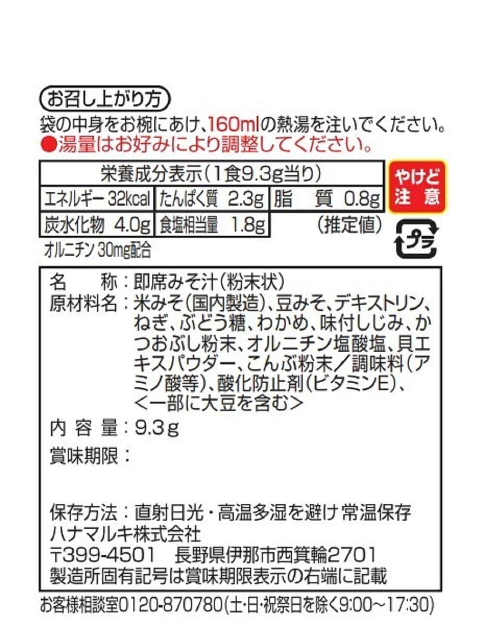 米みそ(国内製造)、豆みそ、デキストリン、ねぎ、ぶどう糖、わかめ、味付しじみ、かつおぶし粉末、オルニチン塩酸塩、貝エキスパウダー、こんぶ粉末/調味料(アミノ酸等)、酸化防止剤(ビタミンE)、〈一部に大豆を含む〉