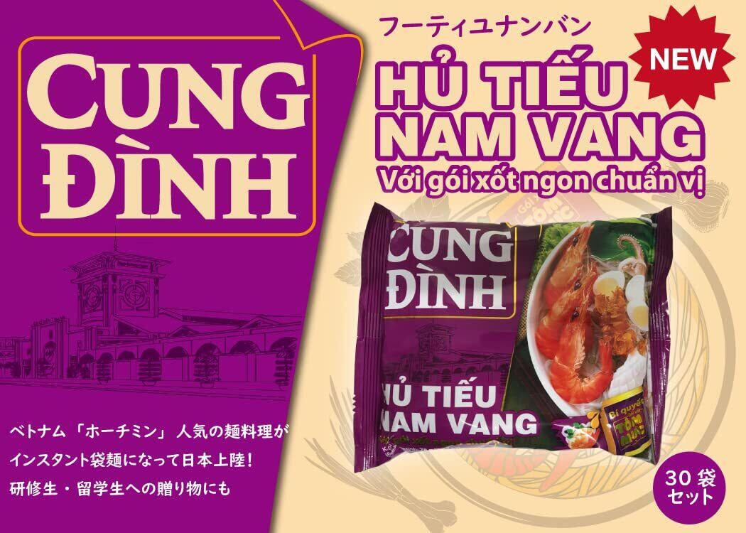 ベトナム「ホーチミン」人気の麺料理がインスタント袋麺になって日本上陸! 研修生・留学生への贈り物としてもどうぞ。 「フーティユナンバン」は、ホーチミンなどベトナム南部で愛される麺料理。 ・料理名の由来: フーティユ…フォーよりも幅の細い角ばった麺。 ナンバン…カンボジアの首都【プノンペン】を指す。 ベトナム南部と地理的にも近しいカンボジアにルーツを持つ料理。 ・味の特徴: チキンとエビ・カニなどの魚介がベースのさっぱりとしたスープに、にんにくのパンチが効いていることが特徴です。 “フーティユ”(Hu Tieu): ベトナムで食べられる米麺の一つ。 “フーティユナンバン”( Hu Tieu Nam Vang):フーティユを使用したメニューの一つ。 すべてのベトナム人がフーティユナンバンを知っている訳ではありませんが、ベトナム南部の人が特に好きなメニュー“フーティユ”は路地にある食堂・専門店や屋台、さらには豪華なレストランなど、通りの至る所で簡単に見つけることができる身近なメニューです。 屋台やレストランが空いてさえいれば、朝から晩まで、いつでも食べます