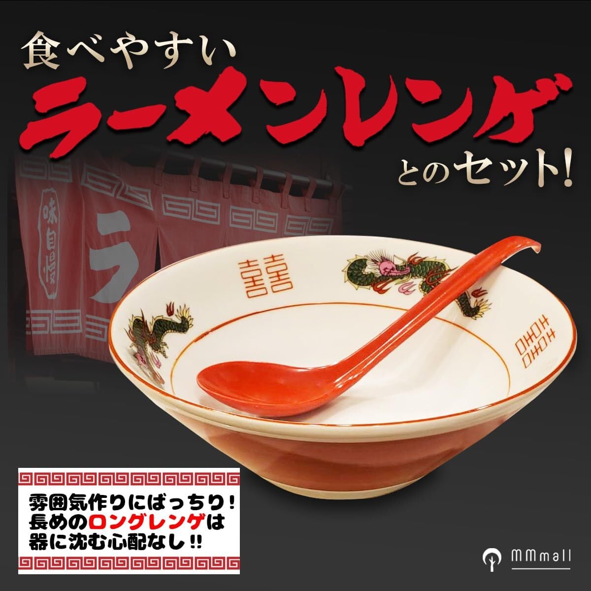 【食べやすいラーメンレンゲとのセット‼】雰囲気作りにばっちり!長めのメラミン樹脂ロングレンゲとのセットです。器に沈む心配なしのレンゲはスープをすくうのにもってこいのアイテムです。