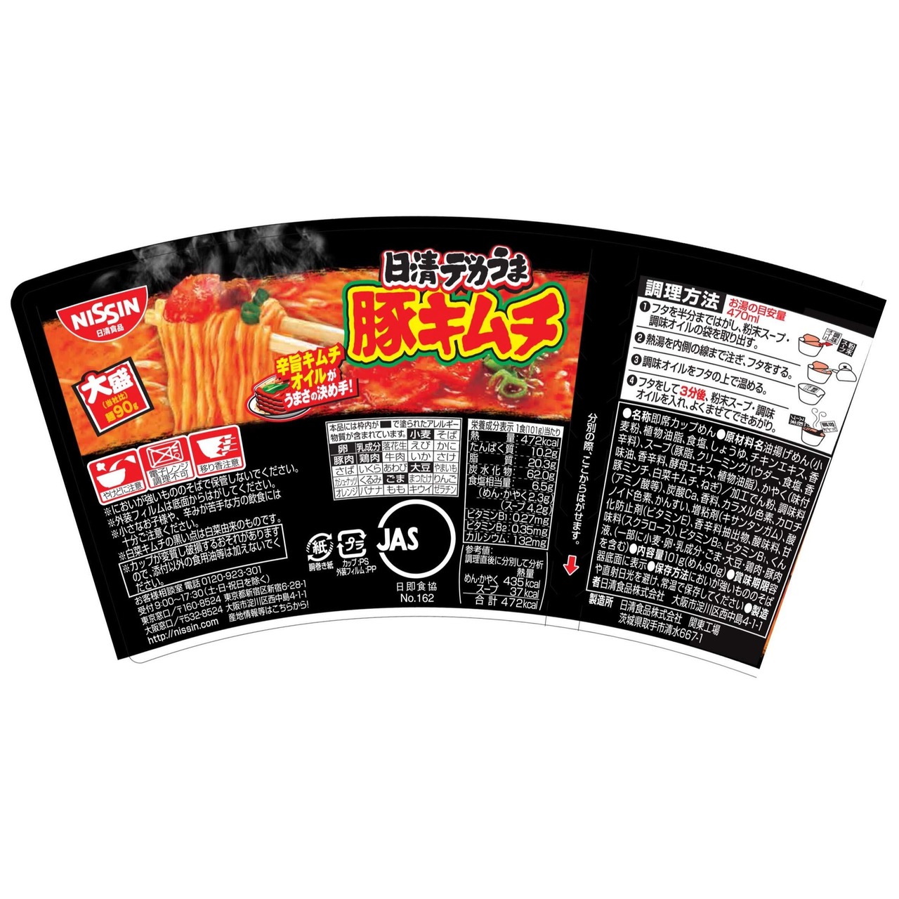 1.フタを半分まではがし、粉末スープ・調味オイルの袋を取り出す。2.熱湯を内側の線まで注ぎ、フタをする。3.調味オイルをフタの上で温める。4.フタをして3分後、粉末スープ・調味オイルを入れ、よくまぜてできあがり。