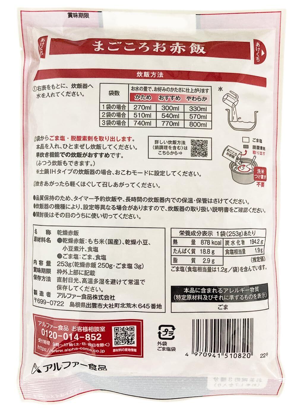 ・乾燥赤飯:もち米(国産)、乾燥小豆、小豆煮汁、食塩 ・ごま塩:ごま、食塩