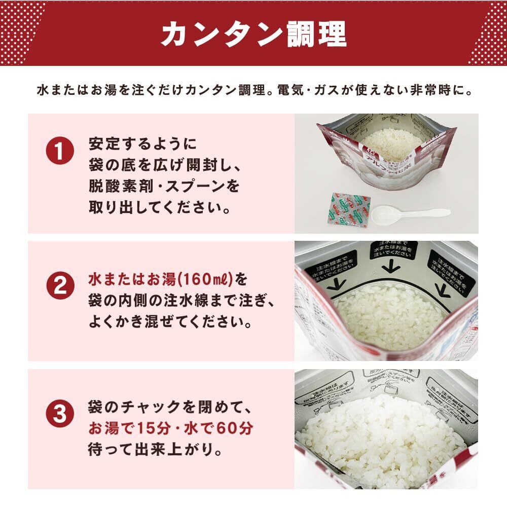 [アルファ化米飯(白米)]うるち米(国産)[アルファ化米飯(五目御飯)]うるち米(国産)、こんにゃく、乾燥しいたけ、食塩、乾燥にんじん、乾燥ごぼう、砂糖、かつお節エキス、パーム油、生姜、乾燥ひじき、ほたてエキス調味料/調味料 (アミノ酸等)、カラメル色素、水酸化カルシウム、酸化防止剤 (V.E) [アルファ化米飯(わかめ御飯)]うるち米(国産)、砂糖、わかめ、食塩、昆布パウダー/調味料(アミノ酸等)