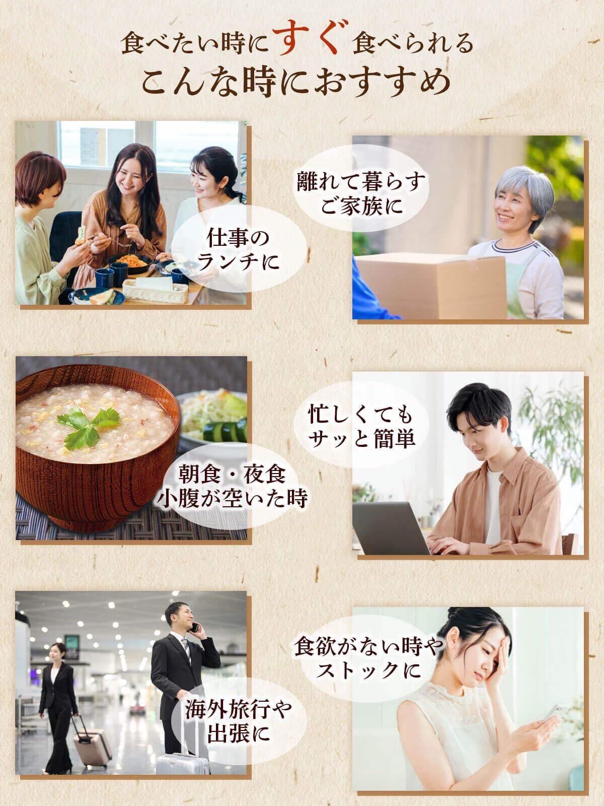 国産 焼 真鯛 赤鶏 北海道産 ほたて かに の身 等 。 忙しい時 や あまり 食欲 が わかない 時 朝食 ランチ 夜食 にも おすすめ 。 簡単 お手軽 で 幅広い年齢層の方々に召し上がって頂けます。