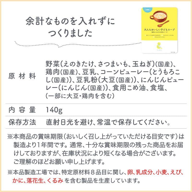 原材料:野菜(えのきたけ、さつまいも、玉ねぎ)(国産)、 鶏肉(国産)、豆乳、コーンピューレー(とうもろこし(国産))、豆乳粉(大豆(国産))、にんじんピューレー(にんじん(国産))、食用こめ油、食塩、 (一部に大豆・鶏肉を含む)