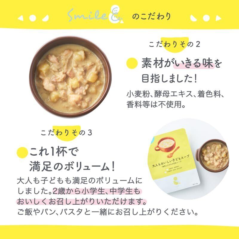 Smile& 国産野菜使用 レトルトスープ「大人もおいしい子どもスープ(鶏肉とえのきの豆乳スープ)2歳~」140g×3個セット 小麦粉不使用 国産野菜 国産鶏 えのきたけ 大豆 ホワイトスープ キノコ 幼児食 レトルト食品 おかず 朝食 朝ごはん