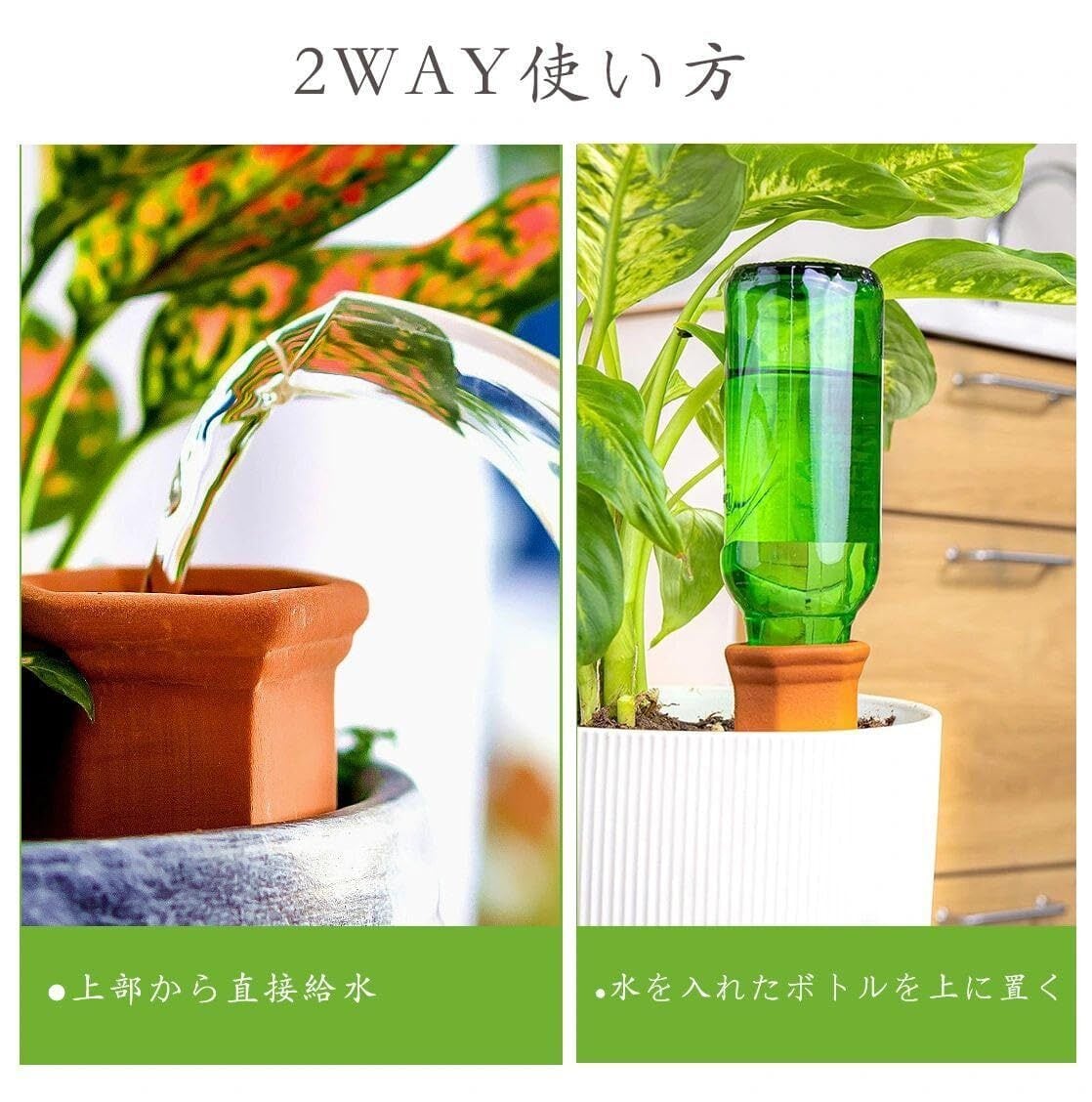 【設置と使用が簡単】設置手順は非常に簡単で、水を満たしたボトルを陶器の灌水器の上部に差し込み、次に灌水器を植物の土壌に挿入するだけです。さまざまな種類のボトル(プラスチックボトルやワインボトルなど)に対応しており、室内外の鉢植え植物に適しています。一度設置すれば、ボトルを交換するだけで水の補充ができます。もちろん、直接ジョウロなどで水やり器に水を注いでもご利用可能です。