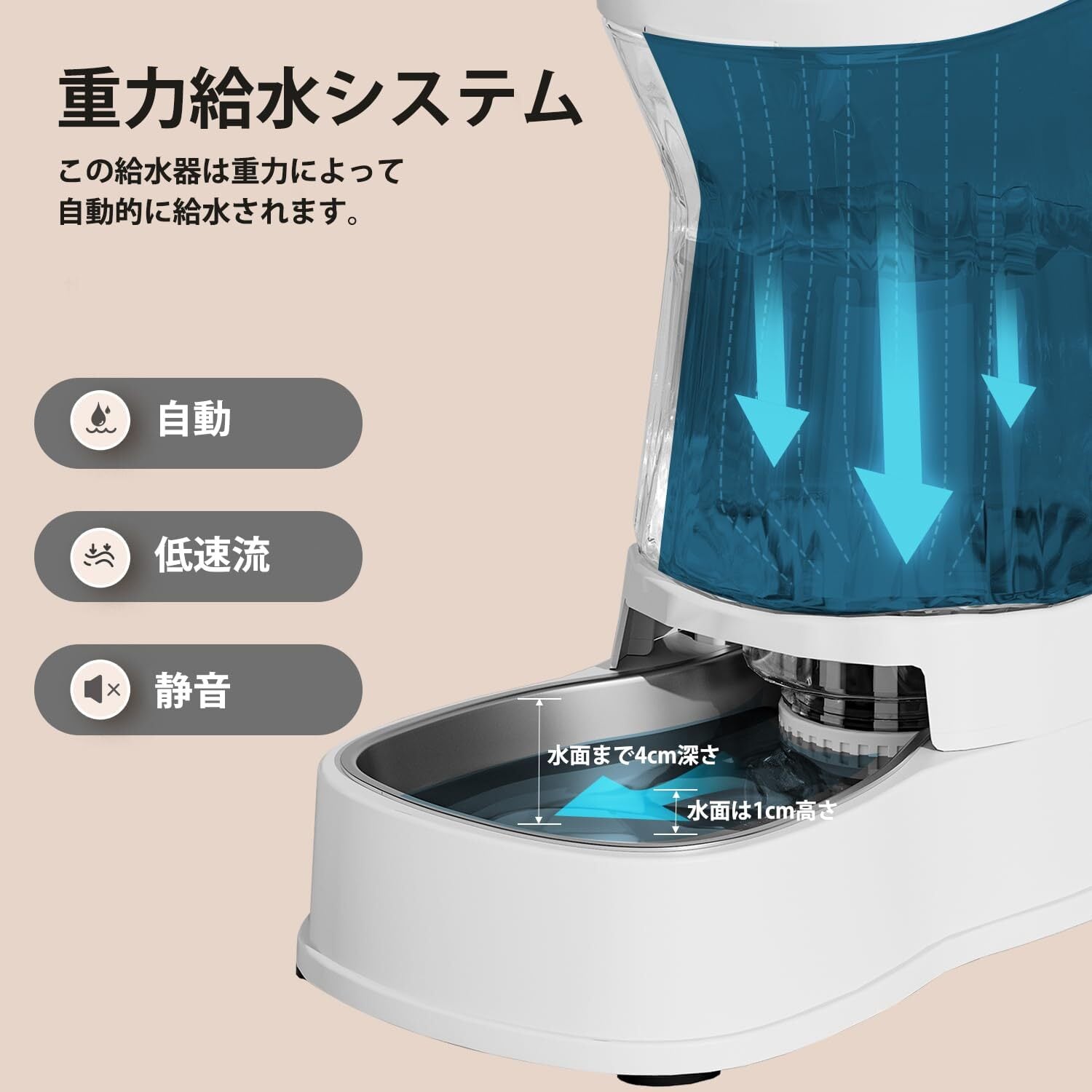【重力式で便利&安心】電源不要の重力式自動給水器。設置するだけで水を自動補給し、電動式のようにコードや充電の手間がありません。停電時でも使用でき、動作音もなく静かで快適。故障リスクが少なく、毎日の使用に安心できる便利な給水器です