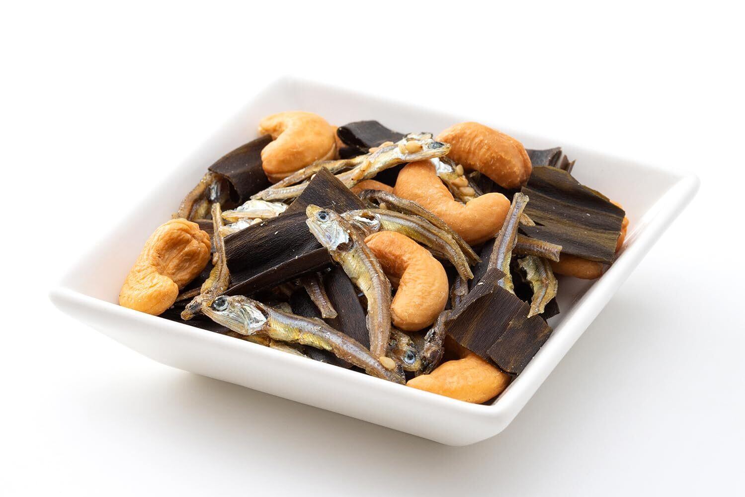 パリッと食感の北海道産こんぶとデ深煎りカシューナッツがおいしい!国内産小魚と組み合わせた3種配合の新感覚ミックスです。