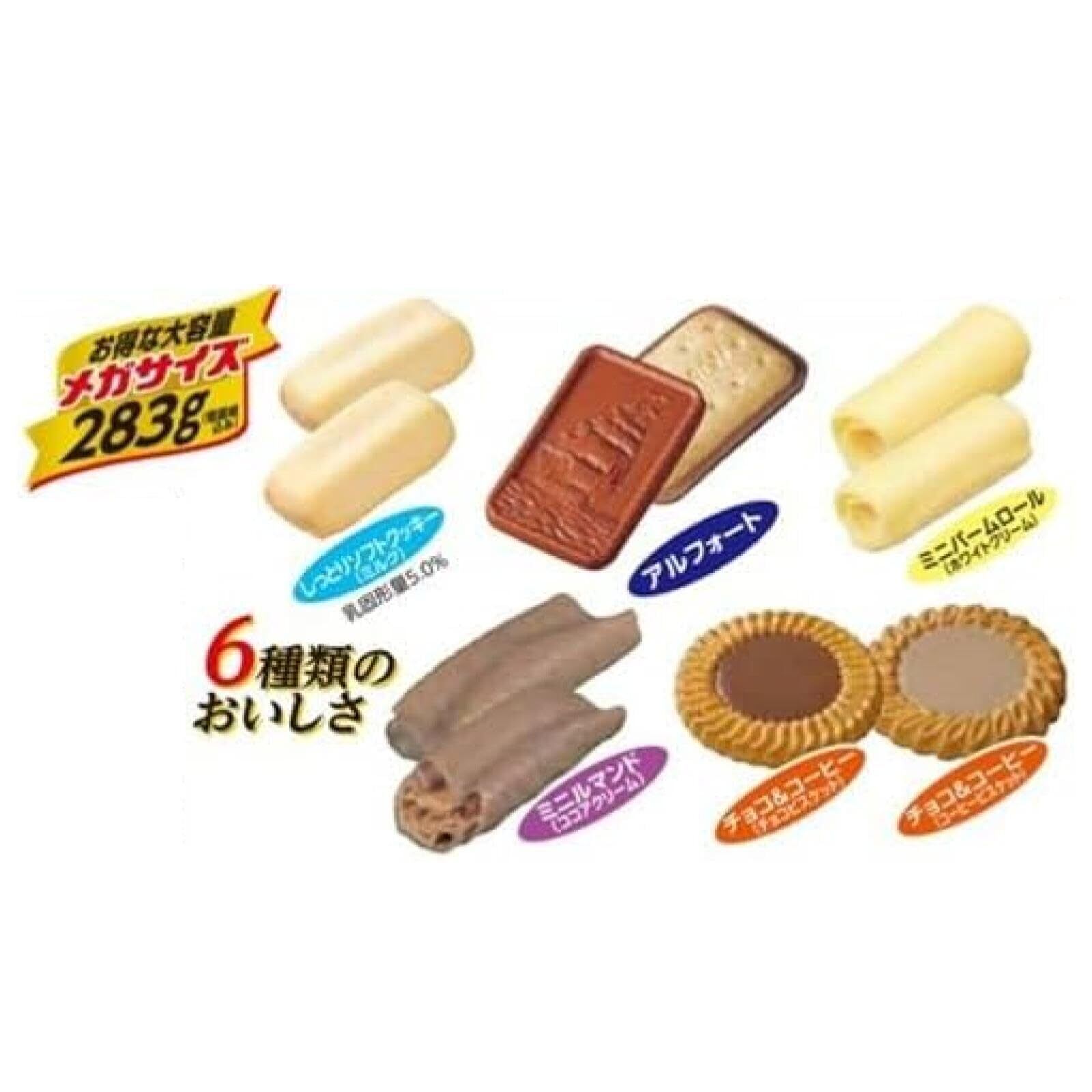 しっとりソフトクッキー(ミルク)、アルフォート、ミニバームロール(ホワイトクリーム)、ミニルマンド(ココアクリーム)、チョコ&コーヒー(チョコビスケット、コーヒービスケット)の6種類を詰合せました。