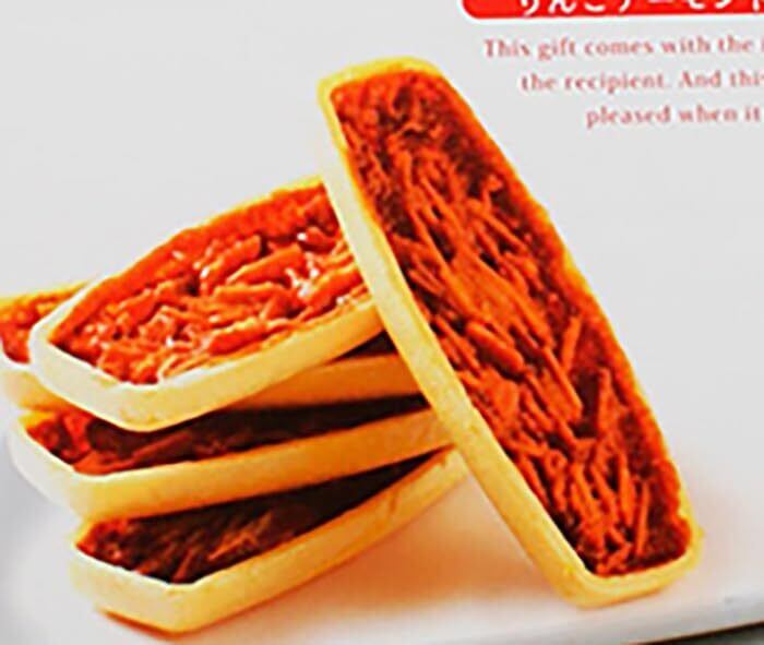 アーモンドスライス、砂糖、もなか皮(でん粉、小麦粉、食用植物油脂)、マーガリン、乳等を主要原料とする食品(クリームパウダー、バターミルクパウダー、脱脂粉乳、食用植物油脂、その他)、りんごジャム(水飴、砂糖、りんごピューレー(長野県産)、りんご濃縮果汁(長野県産))、水飴、蜂蜜、バターオイル、バター、食塩、卵黄粉末/着色料(紅麹、アナトー、カラメル、カロチン)、乳化剤、増粘多糖類、香料、リン酸塩(K)、酸味料、酸化防止剤(トコフェロール、チャ抽出物)、リン酸Ca、保存料(ソルビン酸)、(原材料の一部に小麦、乳成分、卵、大豆、りんごを含む)
