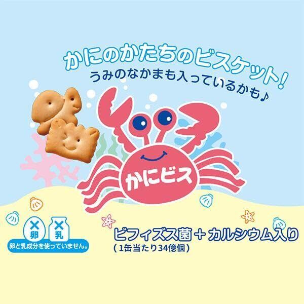 【かにビス】備蓄にぴったりの缶入りビスケット かにのかたちをしたほんのり甘い発酵ビスケットです。 ビフィズス菌+カルシウム入り。
