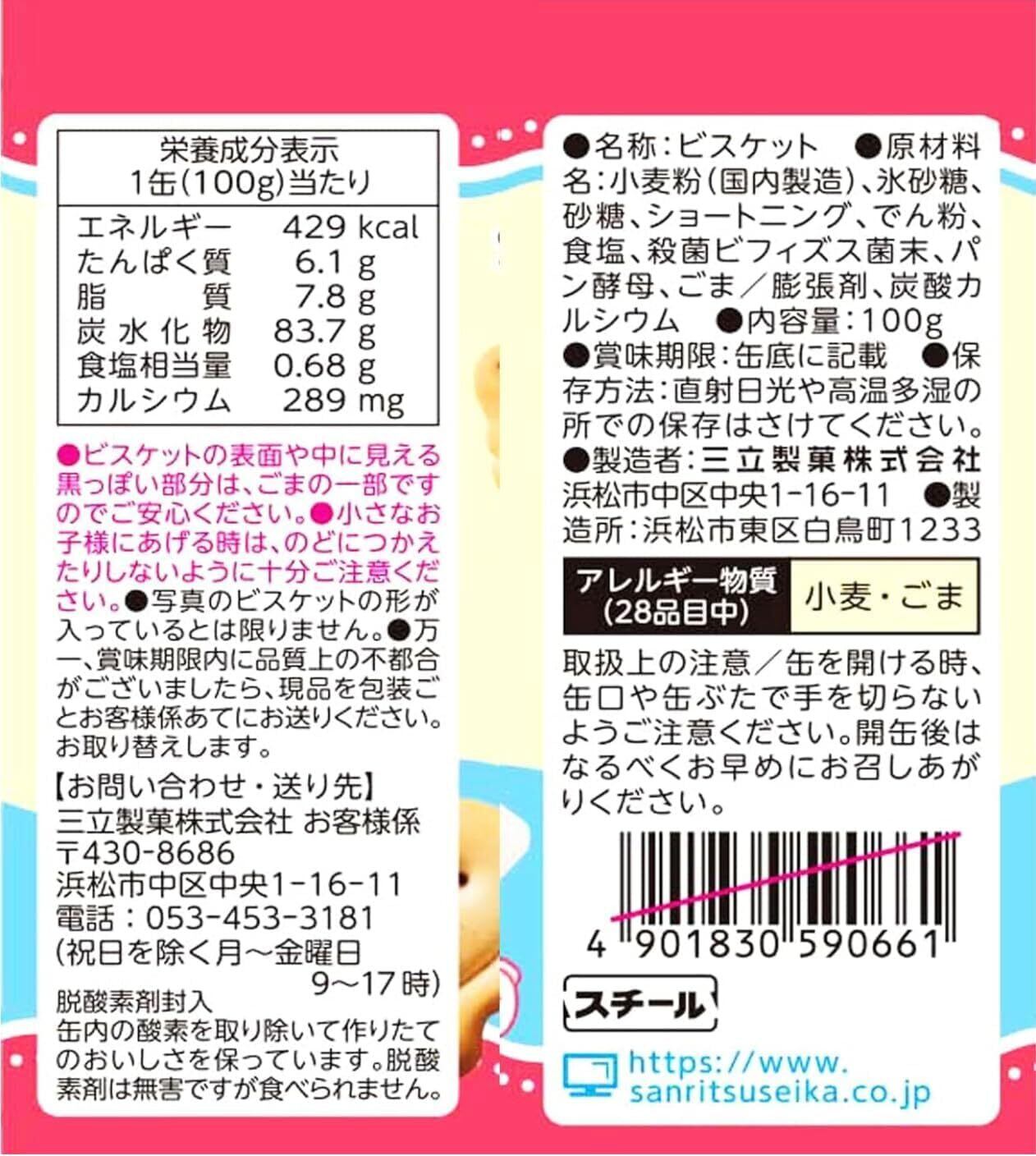 小麦粉(国内製造)、氷砂糖、砂糖、ショートニング、でん粉、食塩、殺菌ビフィズス菌末、パン酵母、ごま/膨張剤、炭酸カルシウム