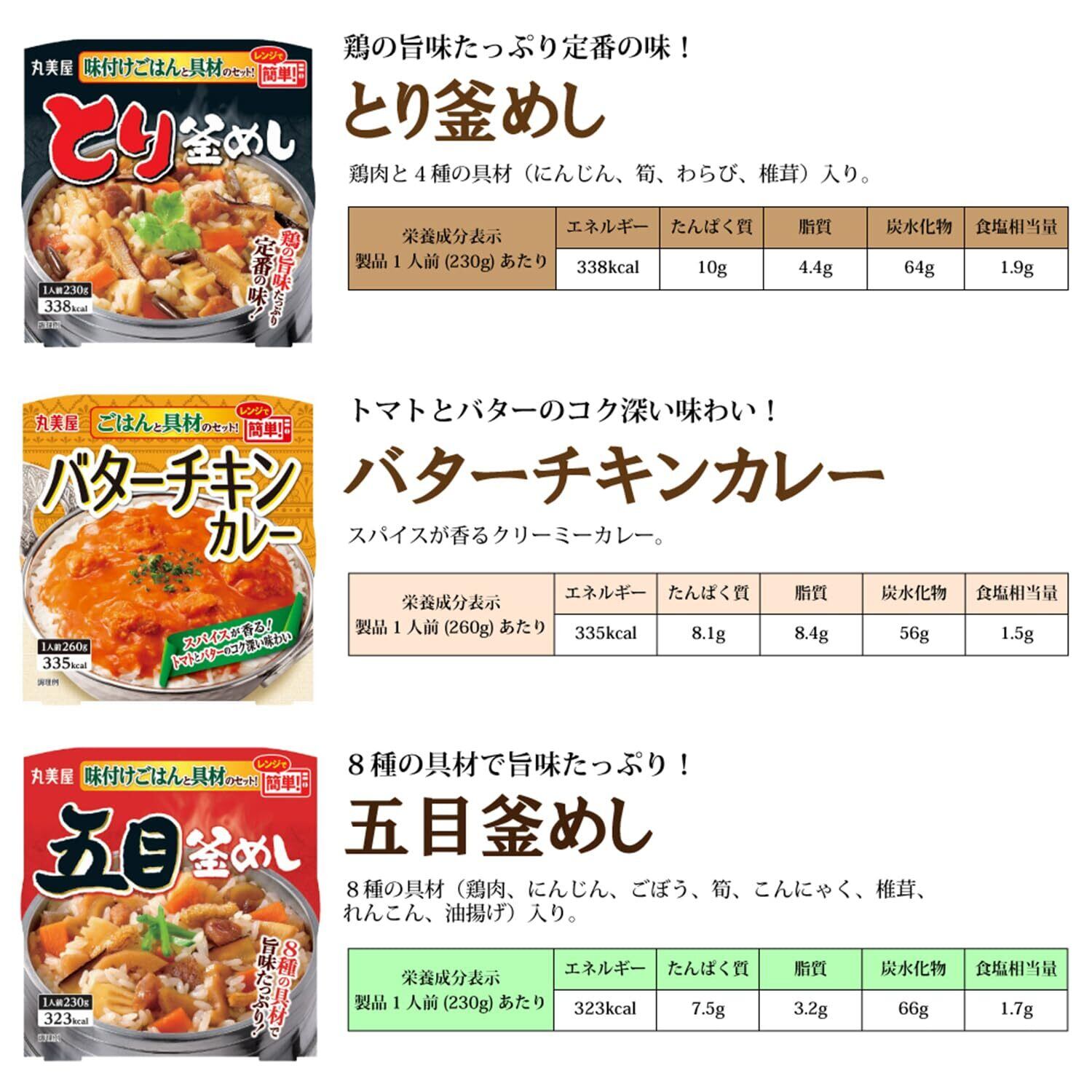 【セット内容】とり釜めし 230g ×1、バターチキンカレー 260g ×1、五目釜めし 230g ×1、ビビンバ 254g ×1、炭火焼き風とり丼 249g ×1、五目中華丼 305g ×1、麻婆丼(中辛) 297g ×1、親子丼 285g ×1、天津飯 305g ×1、海鮮あんかけ 300g ×1、牛ガーリックライス 225g ×1、3種のチーズリゾット 220g ×1