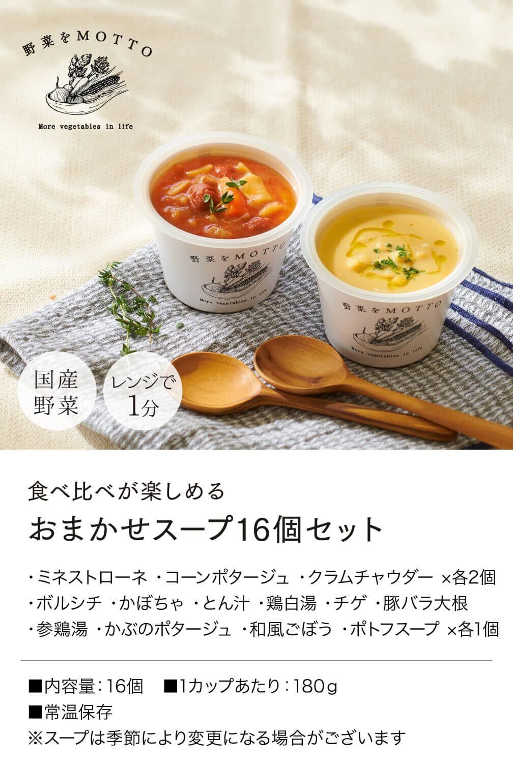 野菜をMOTTO 野菜スープ 16個 セット (おまかせ/ご自宅用) レトルト スープ カップスープ 常温保存 (レンジで1分 / 国産野菜)