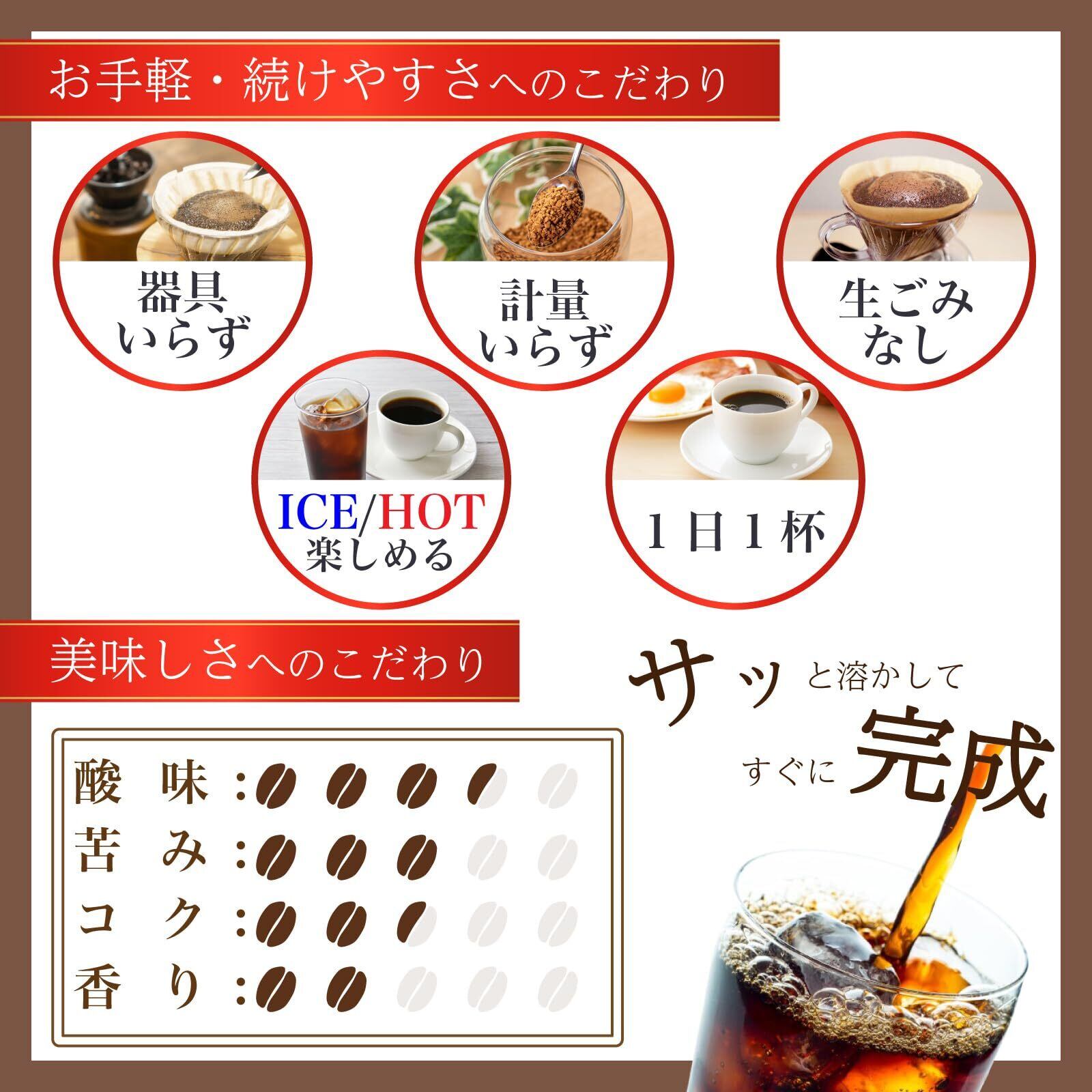 【どのシーンでも飲みやすいブラックコーヒーテイスト】 深いコクと香りで楽しめる1杯に。お好みで牛乳や豆乳でもサッと溶けるので ダマになるストレスもなくいただけます。