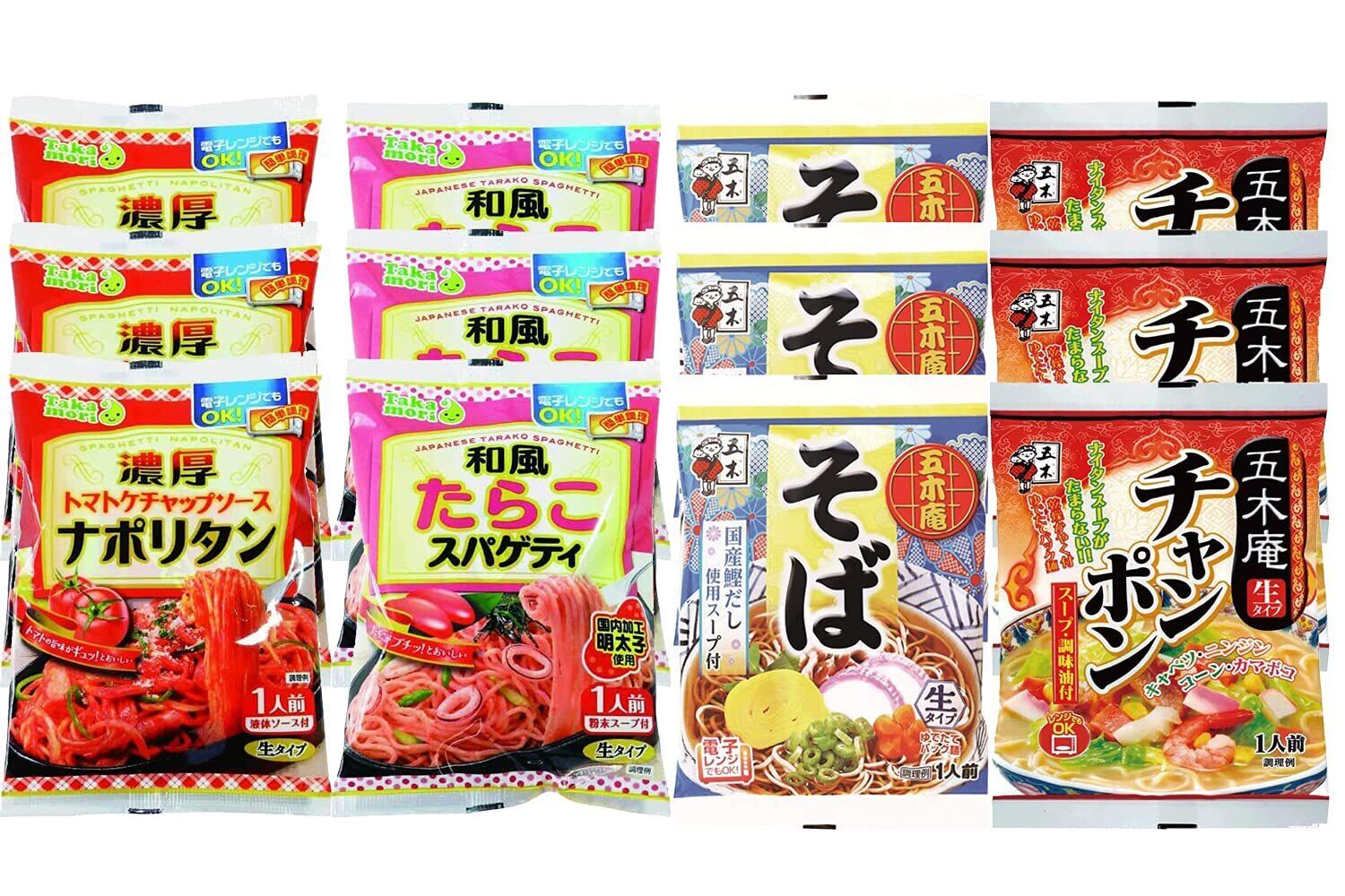 五木食品 そば&ちゃんぽん&パスタ 各3個セット(五木庵そば/五木庵チャンポン/濃厚ナポリタン/和風たらこ 計12個)(セット商品)(電子レンジ調理可能)