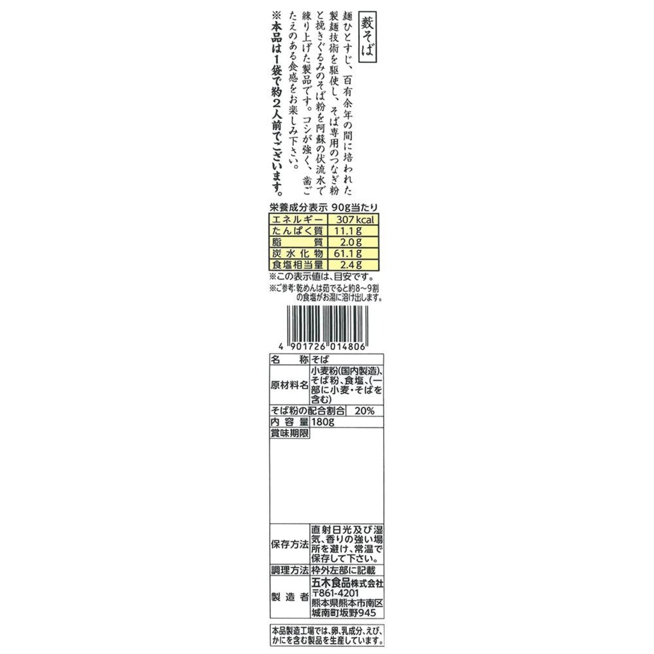 なめらかな口当たりで粘弾性のある、そば粉専用おつなぎ粉と挽きぐるみのそば粉を阿蘇の伏流水で練り上げた乾そばです。コシが強く、つるつるとした歯ごたえのある食感が特徴です。