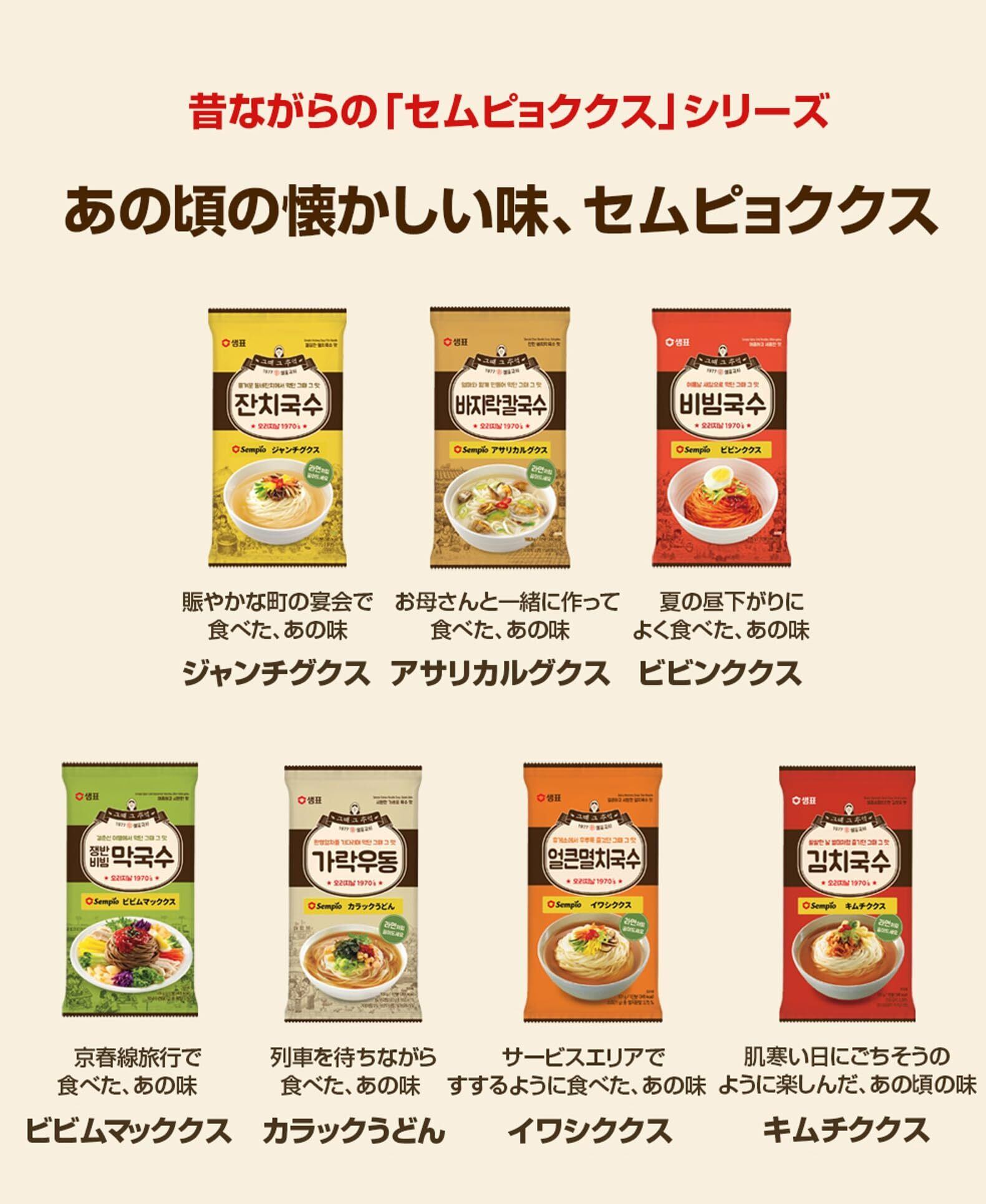昔ながらのセムピョククスシリーズ! 懐かしの韓国の味を手軽に楽しめる本格ククス! 麺とスープがセットになっていて、どなたでも簡単に本格的な一杯が作れます。 体に優しい韓国の家庭の味に、懐かしい思い出をプラス。 昔ながらのセムピョククスをぜひご家庭でお楽しみください。 昔のやり方から学んだ、コシのある麺 手で打つ昔の製法から学び、真空熟成半乾燥製法で 生地の中の空気をしっかり抜き、熟成させることでさらにコシのある食感に仕上げました。 しっかりと味を引き出したスープとタレ 厳選した素材を使い、伝統的な方法で 澄んでさっぱりとした味わいに、しっかりと旨味を引き出したスープとタレを加えました。