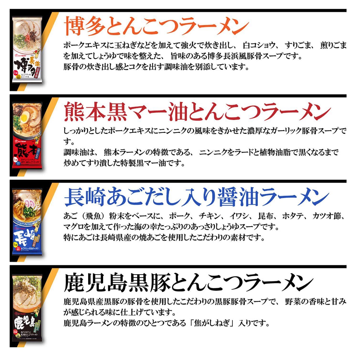 【セット内容】博多とんこつラーメン 185g×1、熊本黒マー油とんこつラーメン 186g×1、長崎あごだし入り醤油ラーメン 178g×1、鹿児島黒豚とんこつラーメン 185g×1、久留米濃厚とんこつラーメン 194g×1、大分鶏白湯ラーメン 186g×1、佐賀牛塩ラーメン 185g×1、宮崎辛麺風ラーメン 186g×1<br>