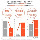 パリパリ食感でしっかりおいしい 糖質46%オフ(※) パスタスナック。1袋(17g) 食べても糖質4.9g、カロリー65kcal、食物繊維は6.5g (※)当社の一般的なパスタスナック(トマト味)と比べ、糖質を46%低減しています。