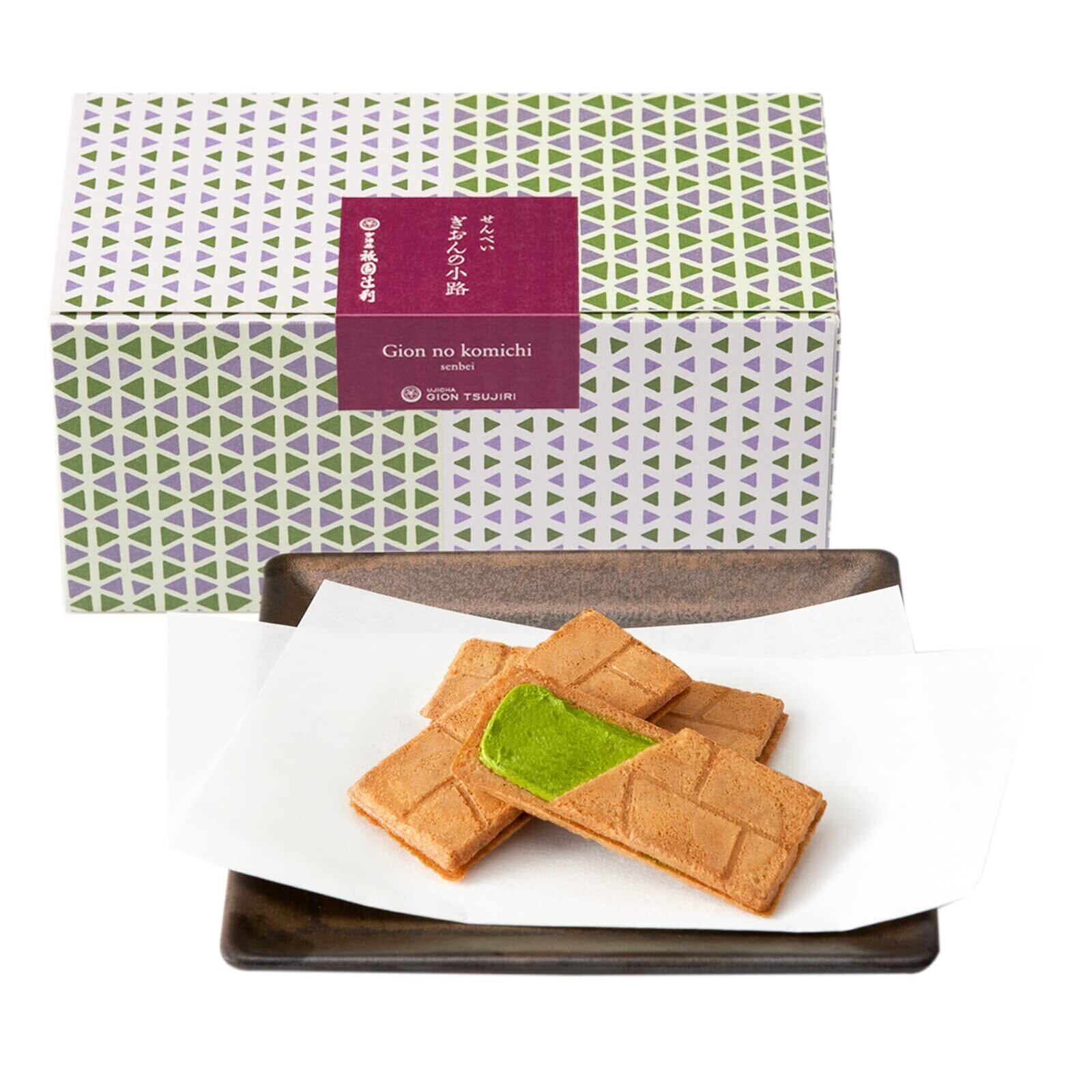 【祇園の茶菓子】丁寧に焼き上げた玉子せんべいで、宇治抹茶をたっぷりの抹茶クリームをサンド。祇園の石畳をイメージした上品なお菓子です。