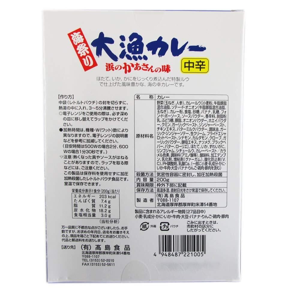 原材料:野菜(玉ねぎ、人参、じゃがいも)(北海道産)、カレールウ(小麦粉、食用油脂(牛脂、豚油)、カレー粉、食塩、砂糖、バナナ、ソテー・ド・オニオン、乳糖、フォン・ド・ボーソース、ソースパウダー、香辛料、脱脂粉乳、ぶどう糖)(日本)、ほたて、いか、ずわいがに(北海道産)、リンゴジャム、シチュールウ、生クリーム、カレーペースト、カラメル色素、調味料(アミノ酸等)、酸味料、(原材料の一部に大豆を含む)