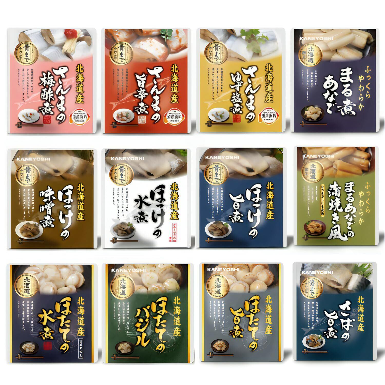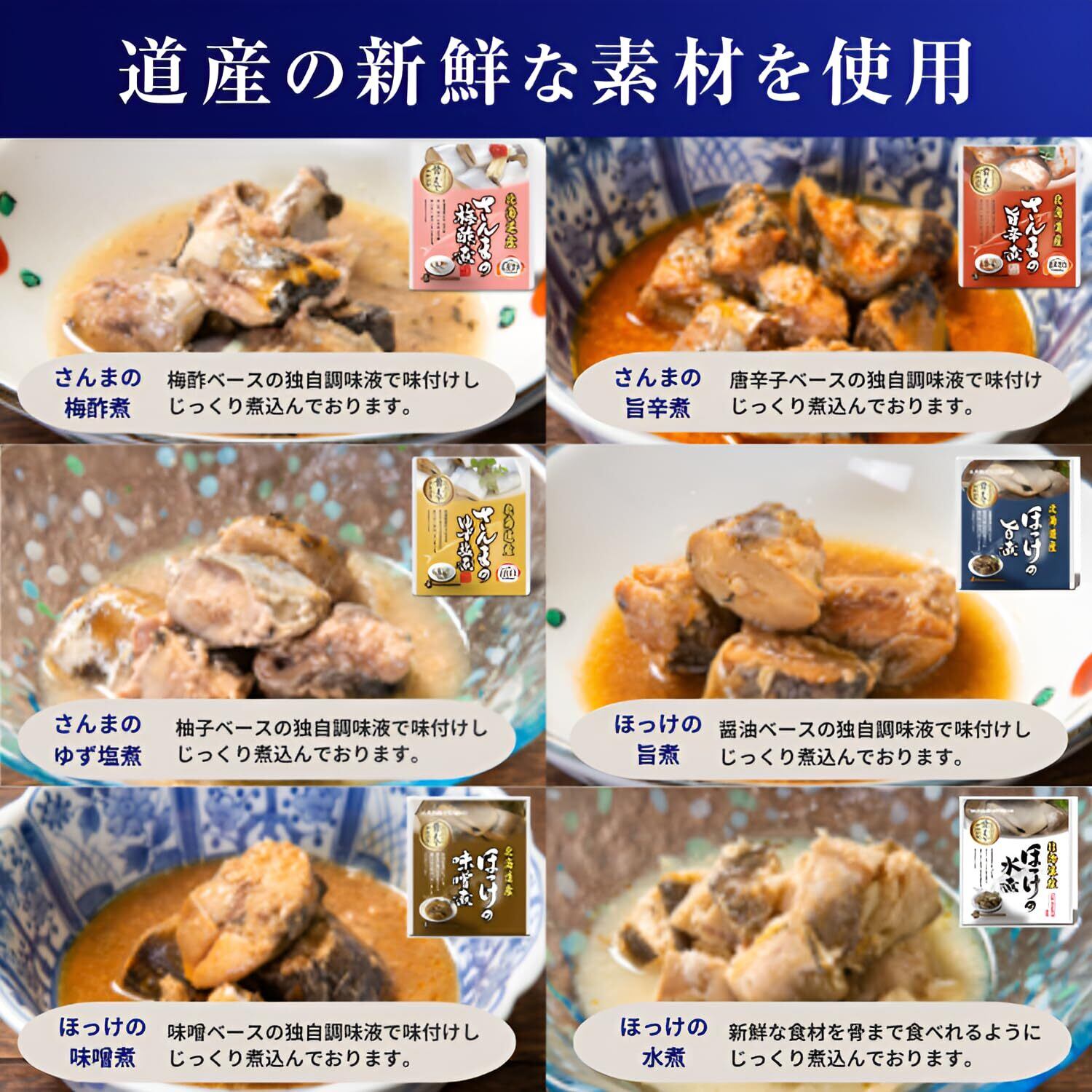 商品に使用している海鮮品:さんま ほっけ さば ほたて まるあなご(外国産) 煮付け方法:旨煮 水煮 味噌煮 梅酢煮 旨辛煮 ゆず塩煮 バジル