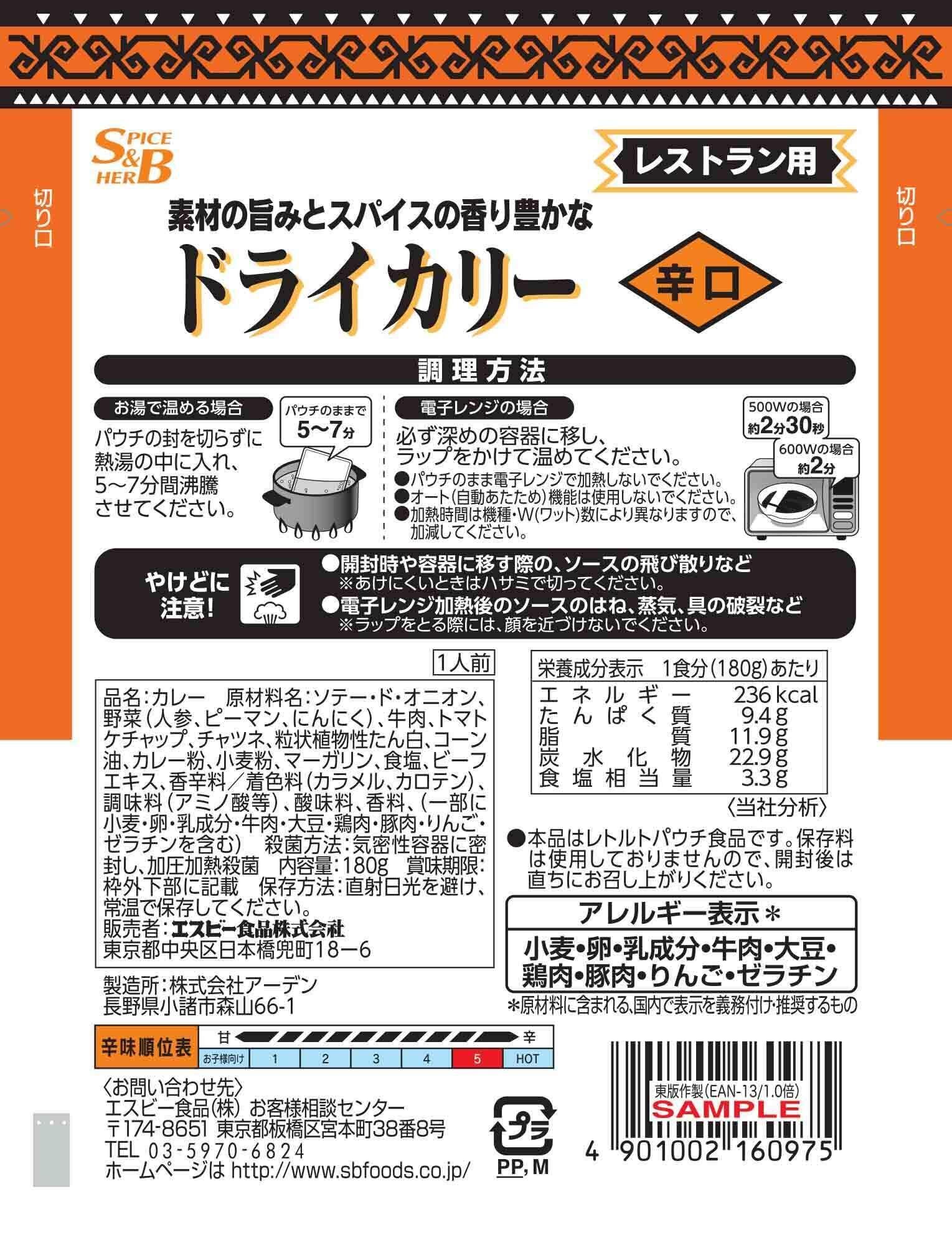 原材料:ソテー・ド・オニオン、野菜(人参、ピーマン、にんにく)、牛肉、トマトケチャップ、チャツネ、粒状植物性たん白、コーン油、カレー粉、小麦粉、マーガリン、食塩、ビーフエキス、香辛料/着色料(カラメル、カロテン)、調味料(アミノ酸等)、酸味料、香料、(一部に小麦・卵・乳成分・牛肉・大豆・鶏肉・豚肉・りんご・ゼラチンを含む)