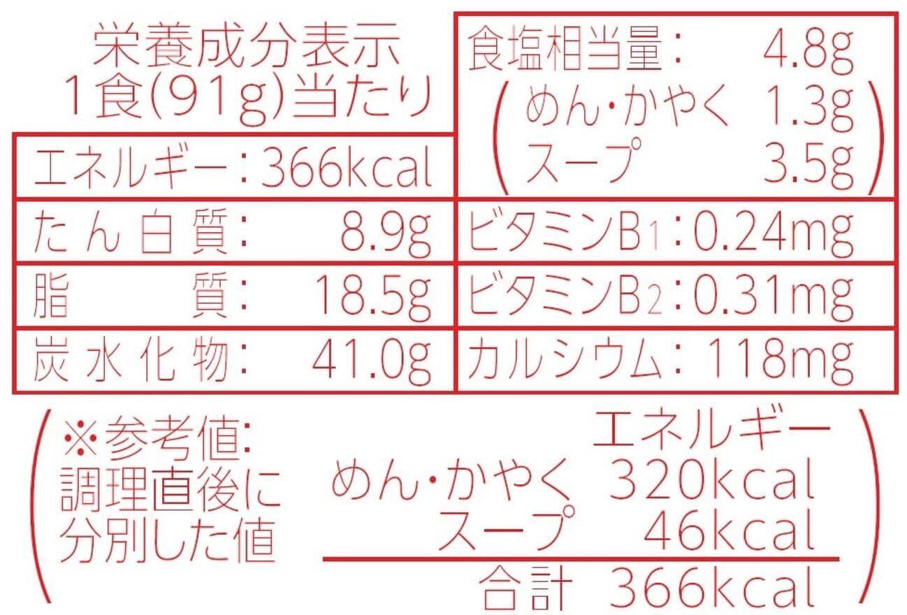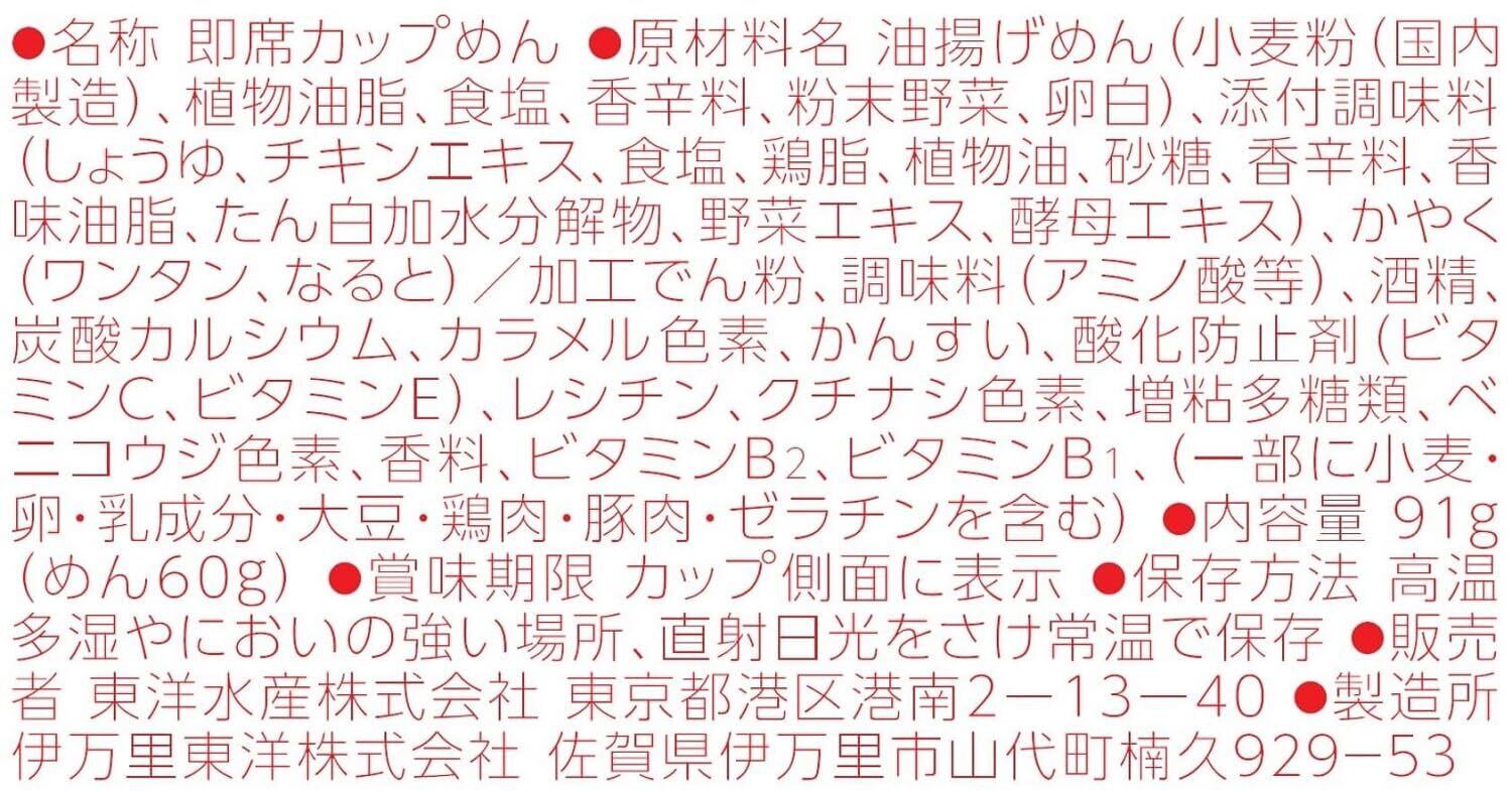 油揚げめん(小麦粉(国内製造)、植物油脂、食塩、香辛料、粉末野菜、卵白)、添付調味料(しょうゆ、チキンエキス、食塩、鶏脂、植物油、砂糖、香辛料、香味油脂、たん白加水分解物、野菜エキス、酵母エキス)、かやく(ワンタン、なると)/加工でん粉、調味料(アミノ酸等)、酒精、炭酸カルシウム、カラメル色素、かんすい、酸化防止剤(ビタミンC、ビタミンE)、レシチン、クチナシ色素、増粘多糖類、ベニコウジ色素、香料、ビタミンB2、ビタミンB1、(一部に小麦・卵・乳成分・大豆・鶏肉・豚肉・ゼラチンを含む)