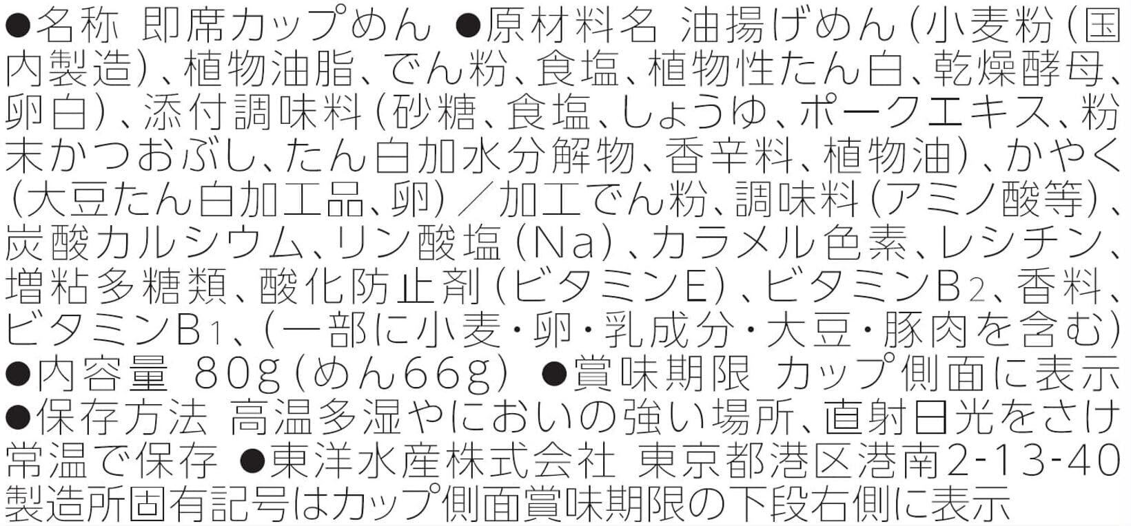 油揚げめん(小麦粉(国内製造)、植物油脂、でん粉、食塩、植物性たん白、乾燥酵母、卵白)、添付調味料(砂糖、食塩、しょうゆ、ポークエキス、粉末かつおぶし、たん白加水分解物、香辛料、植物油)、かやく(大豆たん白加工品、卵)/加工でん粉、調味料(アミノ酸等)、炭酸カルシウム、リン酸塩(Na)、カラメル色素、レシチン、増粘多糖類、酸化防止剤(ビタミンE)、ビタミンB2、香料、ビタミンB1、(一部に小麦・卵・乳成分・大豆・豚肉を含む)