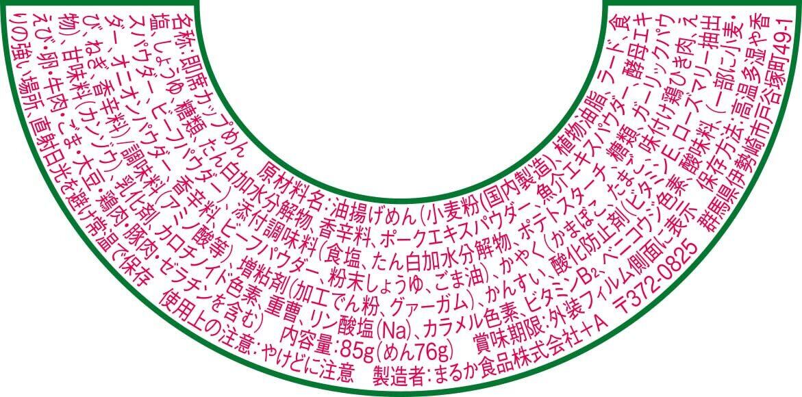 油揚げめん(小麦粉(国内製造)、植物油脂、ラード、食塩、しょうゆ、糖類、たん白加水分解物、香辛料、ポークエキスパウダー、魚介エキスパウダー、酵母エキスパウダー、ビーフパウダー)、添付調味料(食塩、たん白加水分解物、ポテトスターチ、糖類、ガーリックパウダー、オニオンパウダー、香辛料、ビーフパウダー、粉末しょうゆ、ごま油)、かやく(かまぼこ、たまご、味付け鶏ミンチ、えび、ねぎ、香辛料)/調味料(アミノ酸等)、増粘剤(加工でん粉、グァーガム)、かんすい、酸化防止剤(ビタミンE、ローズマリー抽出物)、甘味料(カンゾウ)、乳化剤、カロチノイド色素、重曹、リン酸塩(Na)、カラメル色素、ビタミンB2、ベニコウジ色素、酸味料、(一部に小麦・えび・卵・牛肉・ごま・大豆・鶏肉・豚肉・ゼラチンを含む)