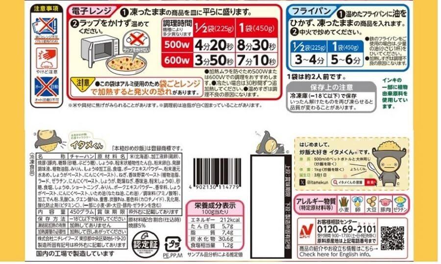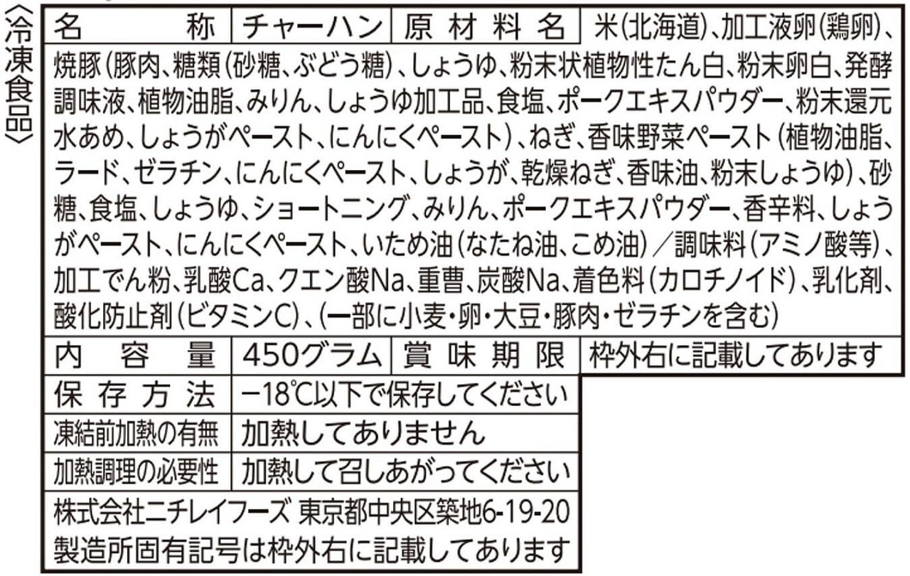 米(北海道)、加工液卵(鶏卵)、焼豚(豚肉、糖類(砂糖、ぶどう糖)、しょうゆ、粉末状植物性たん白、粉末卵白、発酵調味液、植物油脂、みりん、しょうゆ加工品、食塩、ポークエキスパウダー、粉末還元水あめ、しょうがペースト、にんにくペースト)、ねぎ、香味野菜ペースト(植物油脂、ラード、ゼラチン、にんにくペースト、しょうが、乾燥ねぎ、香味油、粉末しょうゆ)、砂糖、食塩、しょうゆ、ショートニング、みりん、ポークエキスパウダー、香辛料、しょうがペースト、にんにくペースト、いため油(なたね油、こめ油)/調味料(アミノ酸等)、加工でん粉、乳酸Ca、クエン酸Na、重曹、炭酸Na、着色料(カロチノイド)、乳化剤、酸化防止剤(ビタミンC)、(一部に小麦・卵・大豆・豚肉・ゼラチンを含む)
