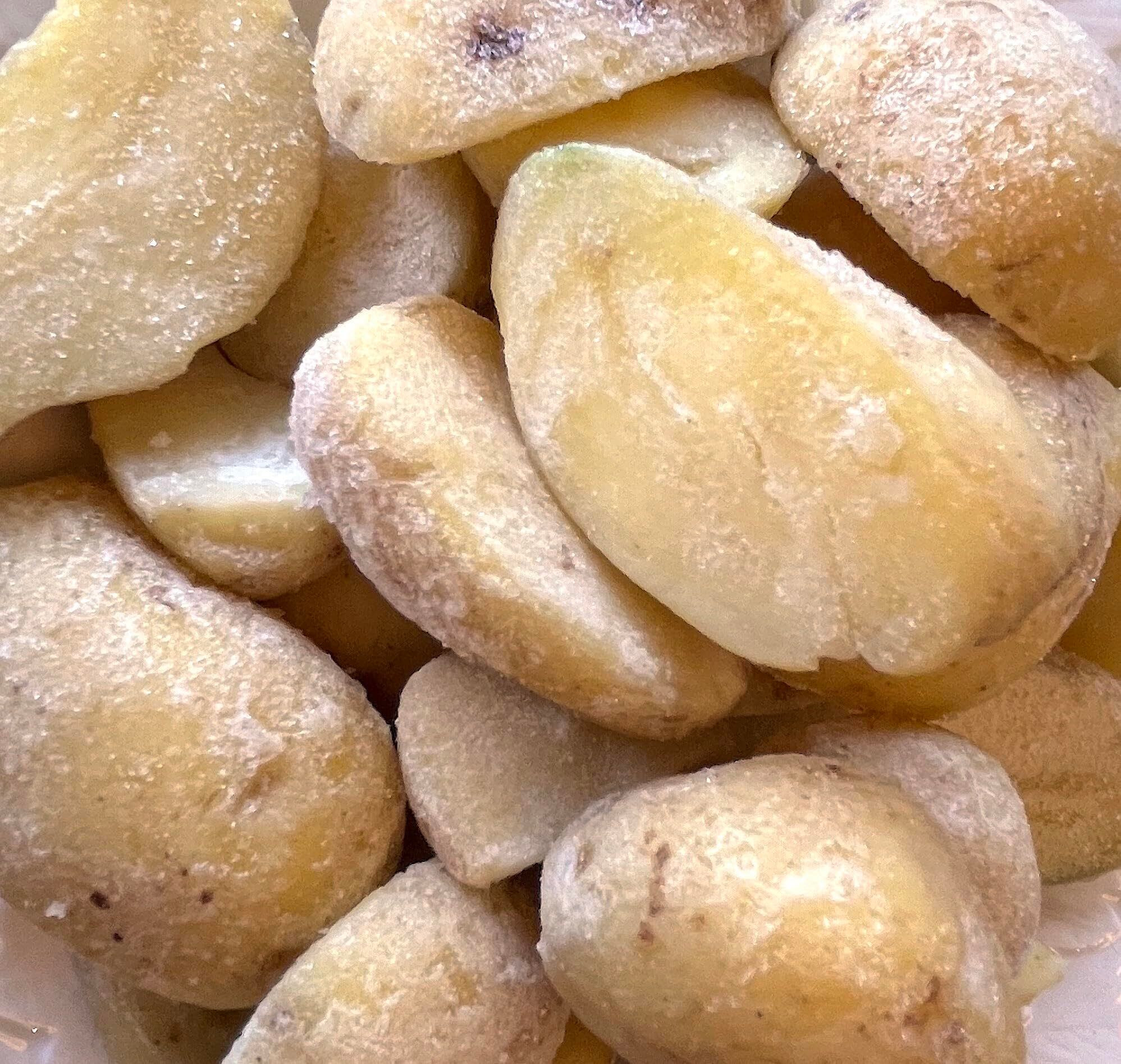 ベルギー産の新鮮な皮付きポテトを半割にして冷凍しました。
