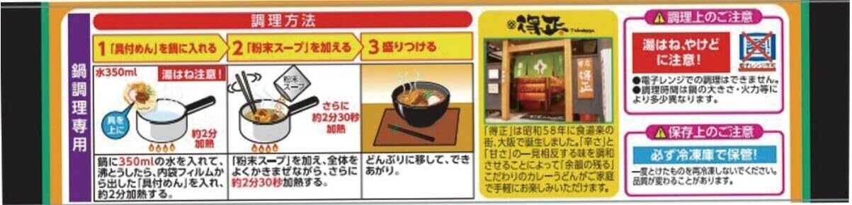 【大阪名物、甘くて辛いカレーうどん】日清食品の有名店カレーうどんシリーズの1品です。大阪の有名店「得正」の味わいを再現したカレーうどんです。ただ辛いだけではなく、甘いだけでもない、辛さと甘さが調和した名店のカレーを再現しました。牛肉、小えびてんぷら、かまぼこ、ねぎが入っています。コシとつるみのある麺がスープによく絡みます。本格的な「得正」の味わいを再現したカレーうどんを、ぜひご家庭で手軽にお楽しみください。
