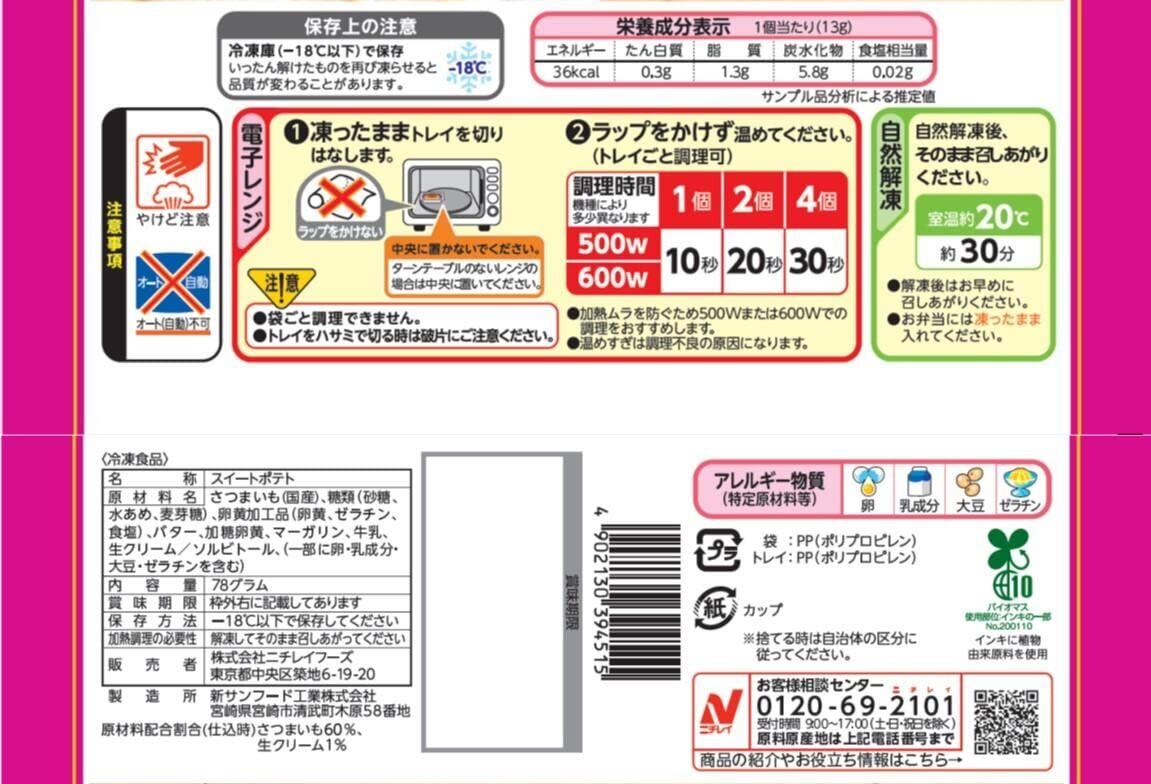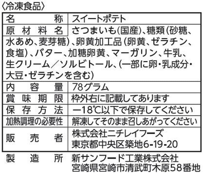 さつまいも(国産)、糖類(砂糖、水あめ、麦芽糖)、卵黄加工品(卵黄、ゼラチン、食塩)、バター、加糖卵黄、マーガリン、牛乳、生クリーム/ソルビトール、(一部に卵・乳成分・大豆・ゼラチンを含む)