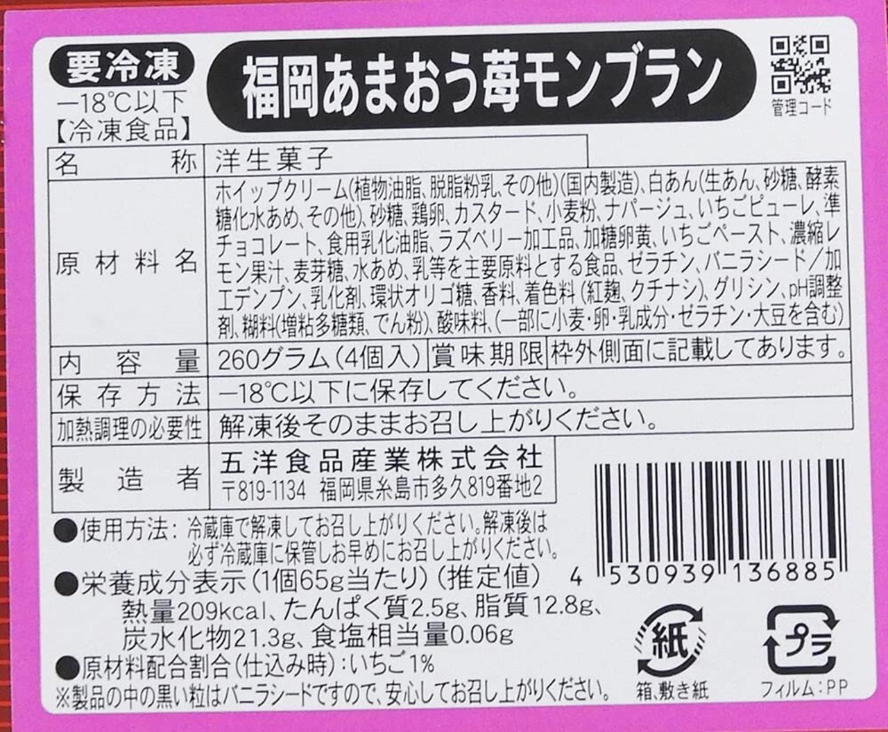 【冷凍】五洋食品産業 福岡あまおう苺モンブラン 260g(4個)