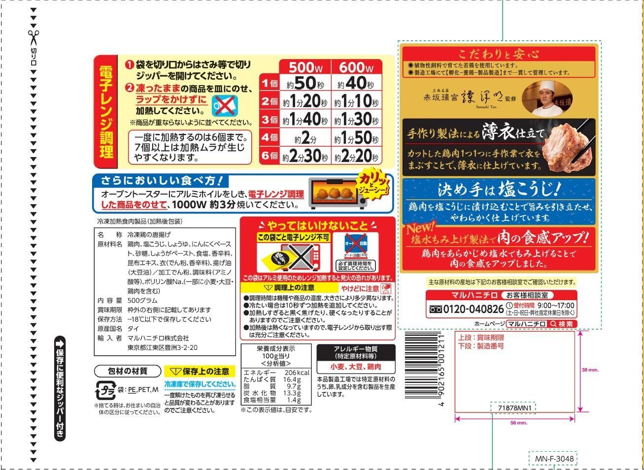 鶏肉、塩こうじ、しょうゆ、にんにくペースト、砂糖、しょうがペースト、食塩、香辛料、昆布エキス、衣(でん粉、香辛料)、揚げ油(大豆油)/加工でん粉、調味料(アミノ酸等)、ポリリン酸Na、(一部に小麦・大豆・鶏肉を含む)