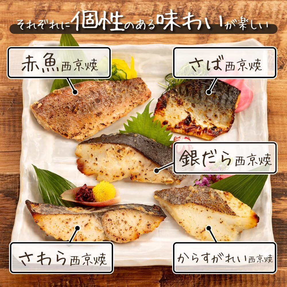 焼き済 西京漬け5種【 骨取り済みでふっくら食感】銀だら・からすかれい・さわら・赤魚・さばの西京焼食べ比べセット <レンチンだから失敗しない> 冷凍食品 おかず 魚 惣菜 西京漬け 焼き魚 仕送り (5種各1個ずつ)