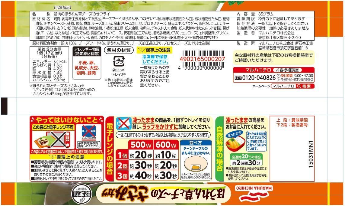 チーズフード、鶏肉、ほうれん草、つなぎ(パン粉、粉末状植物性たん白)、粒状植物性たん白、植物油脂、チキンペースト、砂糖、豚脂、食塩、チーズ加工品、プロセスチーズ、酵母エキスパウダー、卵白粉、こしょう、衣〔パン粉(国内製造)、植物油脂、小麦粉加工品、粉末油脂、液卵白、デキストリン、食塩、粉末状植物性たん白、小麦粉〕、揚げ油(パーム油、なたね油)/加工でん粉、炭酸Ca、安定剤(加工でん粉、増粘多糖類)、トレハロース、pH調整剤、調味料(アミノ酸)、グリシン、カゼインNa、甘味料(ソルビット)、香料、カロチノイド色素、焼成Ca、(一部に小麦・卵・乳成分・大豆・鶏肉・豚肉を含む)