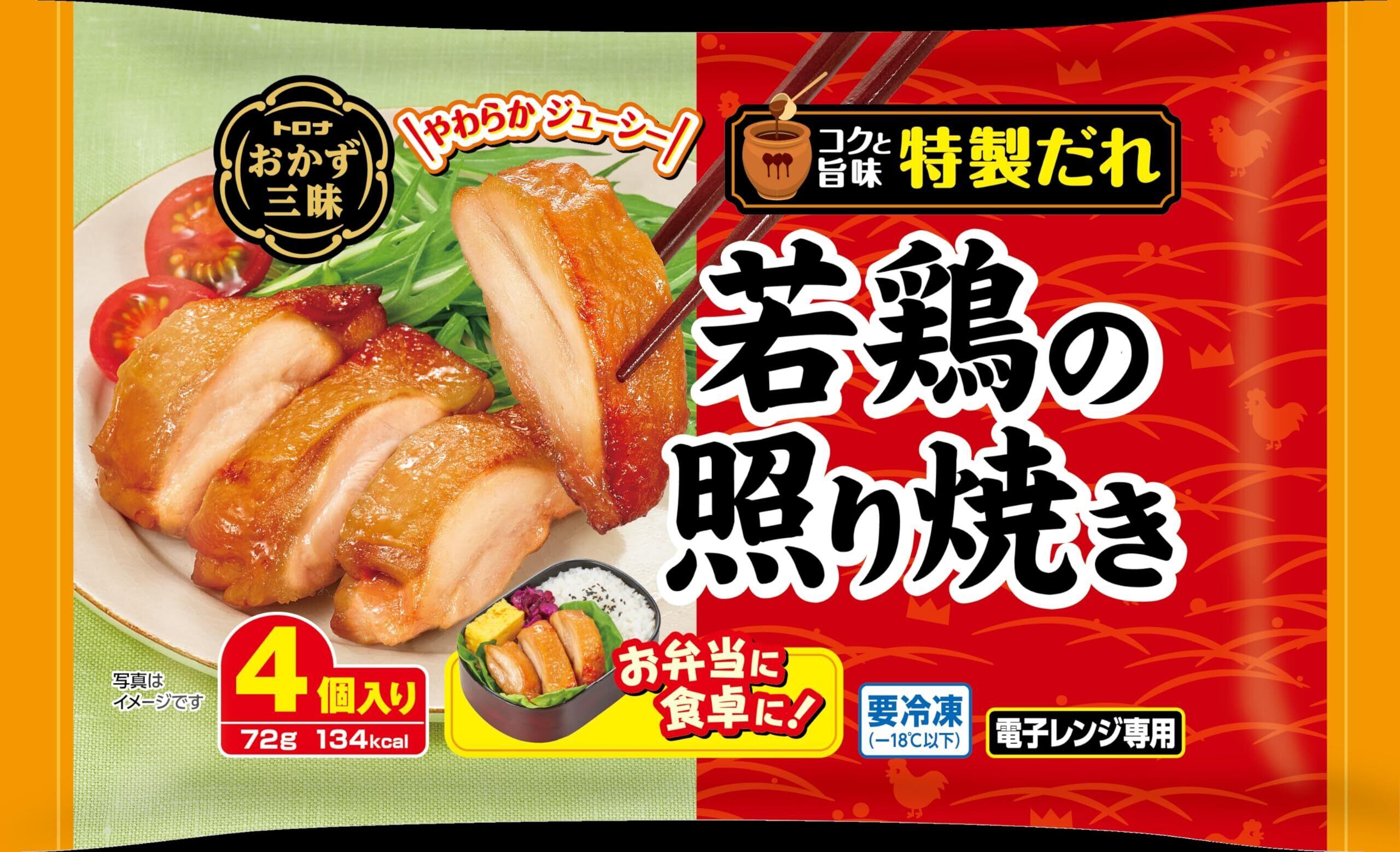"トロナの冷凍おかずです。老若男女に好まれるすぐに使える冷凍食品です。 現在発売中の「若鶏の照り焼き」のリニューアル。お弁当向け商品として、より使いやすいサイズに見直し、入数は3個入り→4個入りに変更。66g(22g×3個入り)→72g(18g×4個入り)。(1個当たりの重量は標準です) お弁当にそのまま入れて、誰でも簡単にできます。ご家庭の冷凍庫に常備して、昼ご飯、夜ご飯、食べ盛りの子供のおやつにお召し上がりください。"