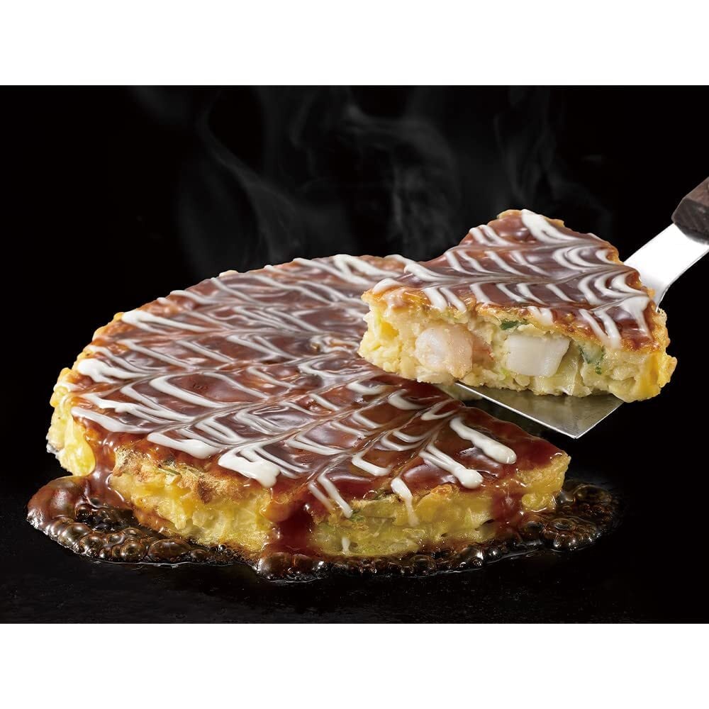 いかとえび入りの海鮮お好み焼です。国産小麦粉に鰹節や昆布のだしを加えたオリジナルレシピの生地を独自の製造方法でふっくらと焼き上げた、いかとえび入りの海鮮お好み焼です。
