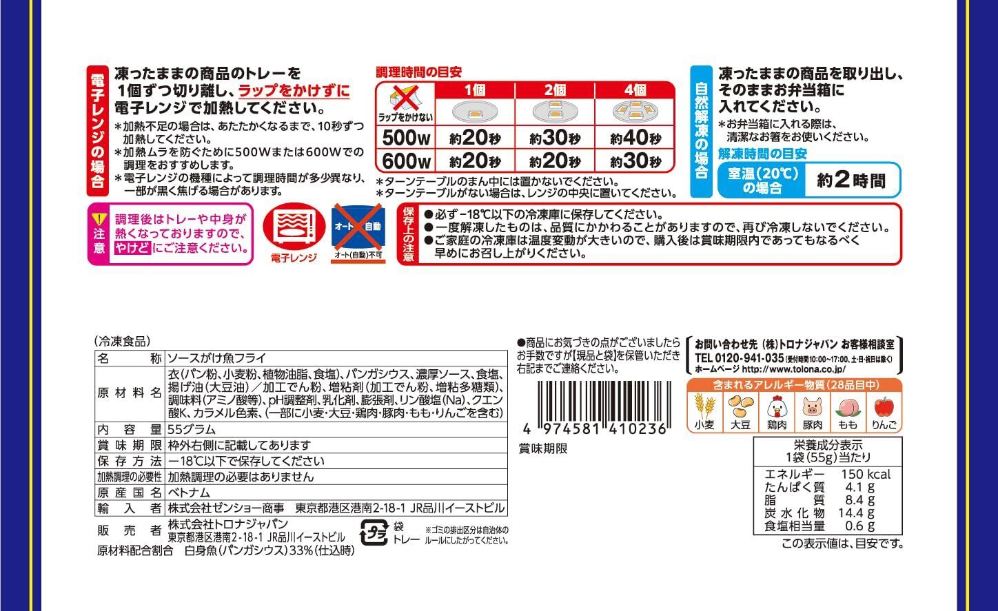 衣(パン粉、小麦粉、植物油脂、食塩)、パンガシウス、濃厚ソース、食塩、揚げ油(大豆油)/加工でん粉、増粘剤(加工でん粉、増粘多糖類)、調味料(アミノ酸等)、pH調整剤、乳化剤、膨張剤、リン酸塩(Na)、クエン酸K、カラメル色素、(一部に小麦・大豆・鶏肉・豚肉・もも・りんごを含む)