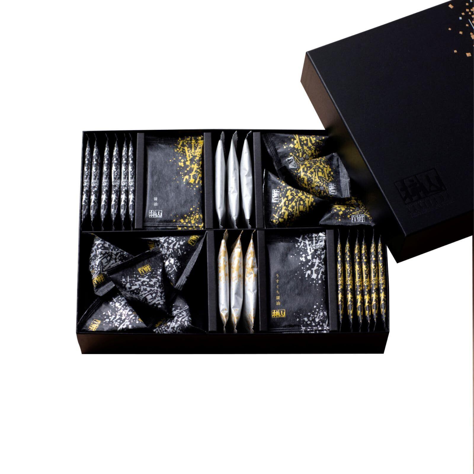 赤坂柿山の一番人気商品。黒地に金銀振りの上品な装いはシーンを選ばずギフト・手土産としてご利用いただけます。