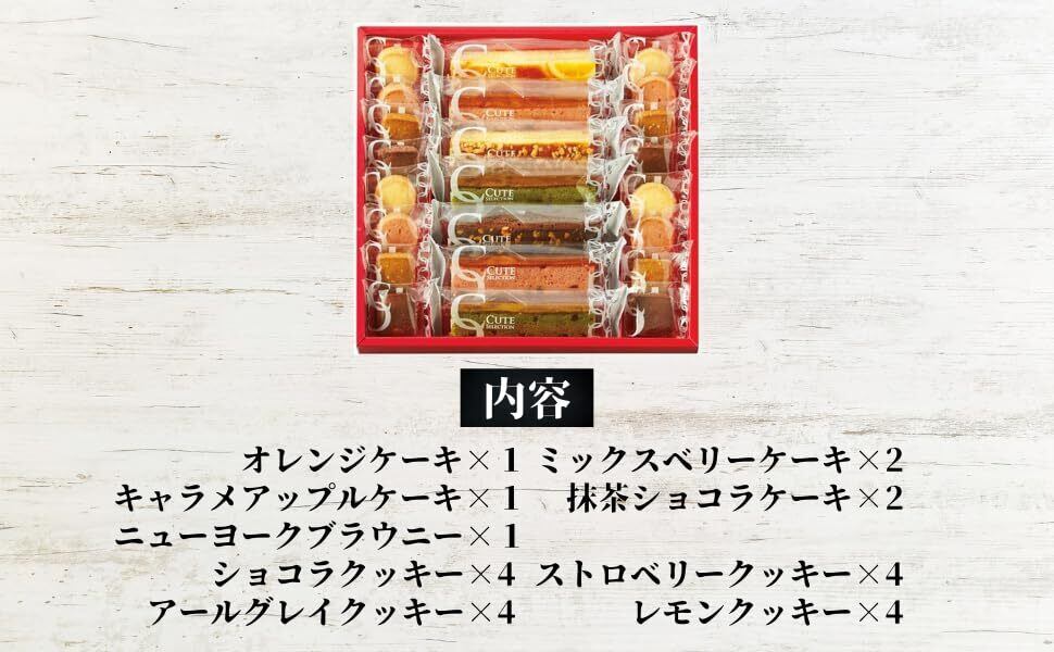 内容 スティックケーキ : ( オレンジケーキ 1個 ミックスベリーケーキ 2個 アップルシュトロイゼル 1個 抹茶ショコラケーキ 2個 ニューヨークブラウニー 1個) クッキー : ( ショコラクッキー 4個 ストロベリークッキー 4個 キャラメルクッキー 4個 塩バタークッキー 4個)